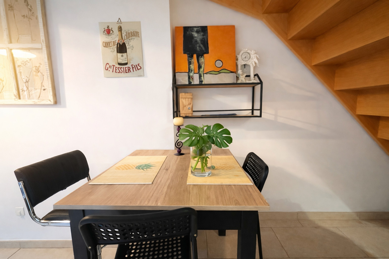 • Cuisine ouverte équipée : Plaques à inductions, four encastré, four micro-ondes, réfrigérateur, machine à café (SENSEO), et ventilateur.