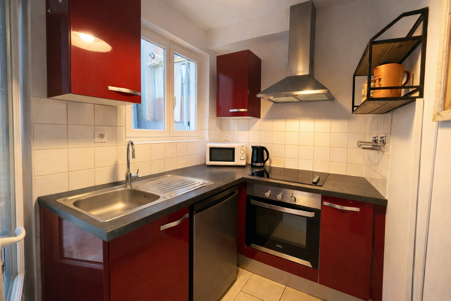 • Cuisine ouverte équipée : Gazinière avec four professionnel, cave à vin, four micro-ondes, réfrigérateur, machine à café (SENSEO), climatisation et ventilateur.