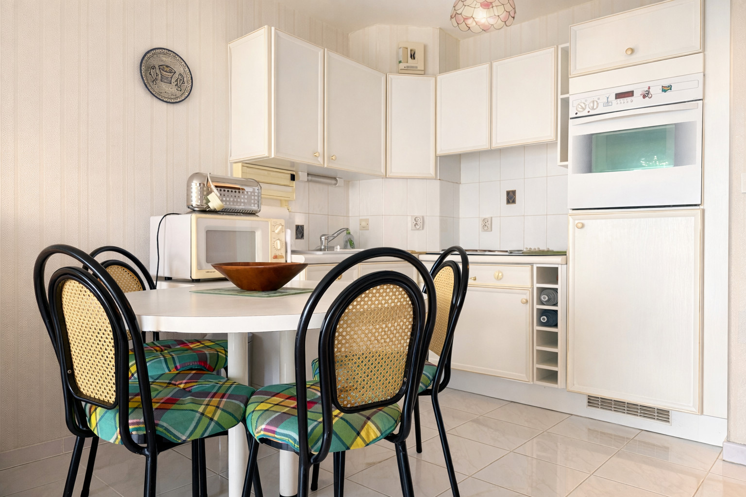 • Cuisine équipée : plaques de cuisson, four, micro-ondes, cafetière, bouilloire, grille-pain, réfrigérateur, vaisselle et ustensiles.