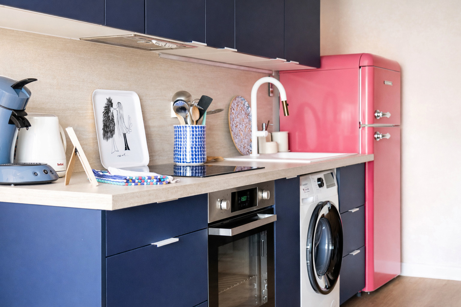 Cuisine ouverte et fonctionnelle tout équipée, bouilloire, four, grille-pain, micro-ondes, cafetière Senseo et une machine à laver.