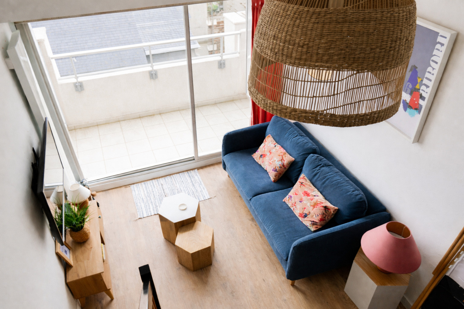 Appartement lumineux, salon-séjour ouvert sur un balcon offrant une vue dégagée, équipé d’un canapé convertible en 140, une table basse, une TV, une table et 4 chaises.