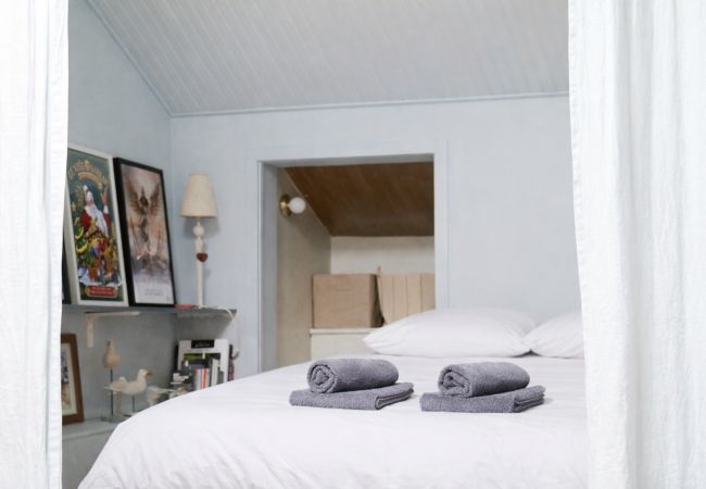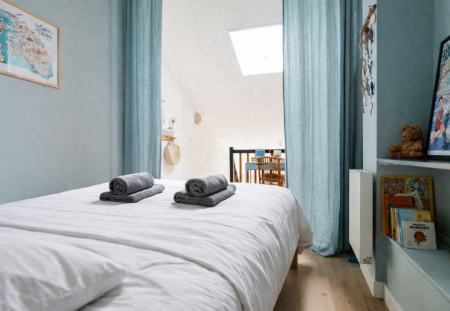 Côté nuit, vous trouverez une chambre mansardée (velux) non fermée à l’étage, avec un lit 140 et de nombreux rangements. Lumineuse et cosy pour des nuits reposantes.