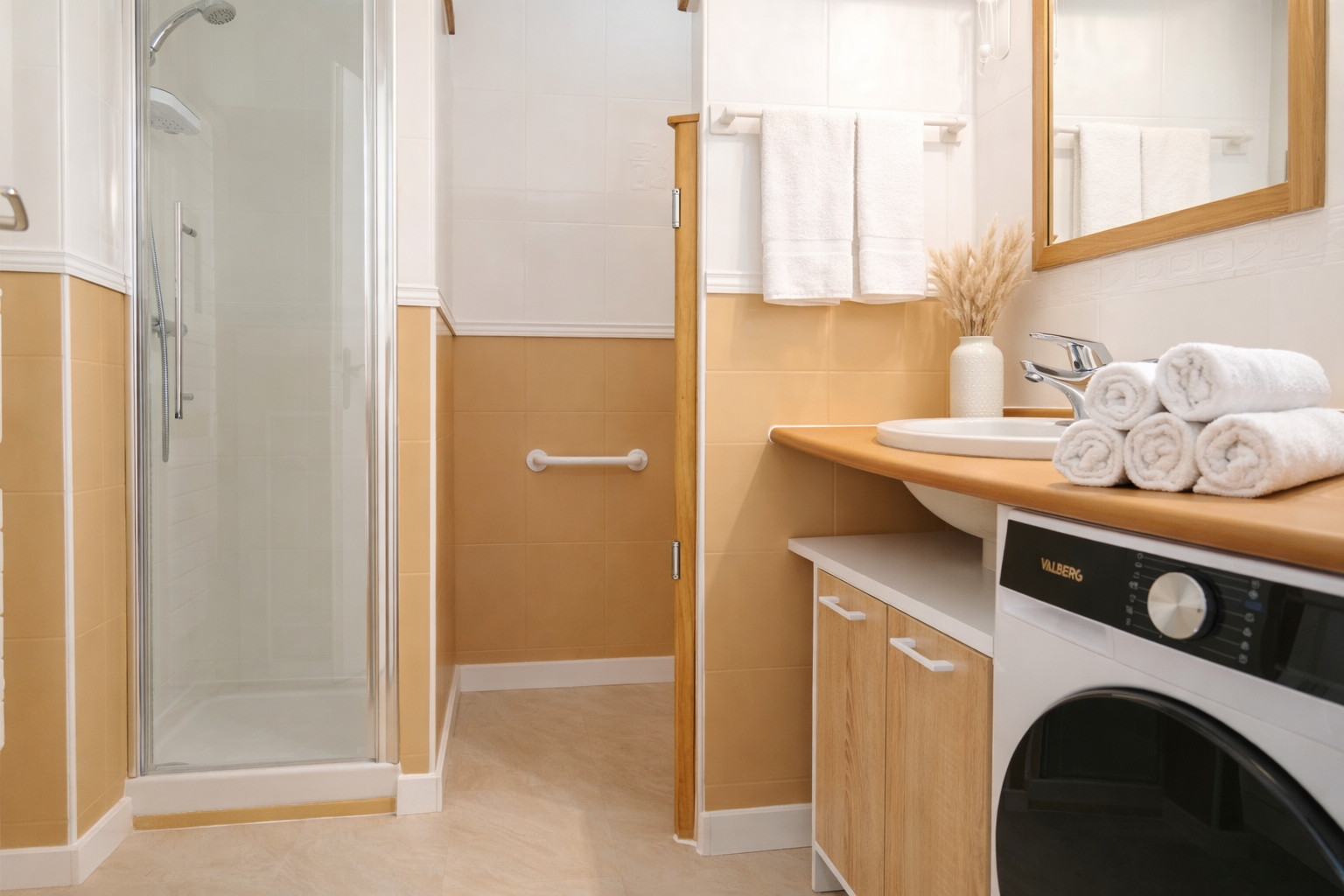 • Salle d’eau avec douche, vasque, sèche-cheveux, machine à laver et WC.