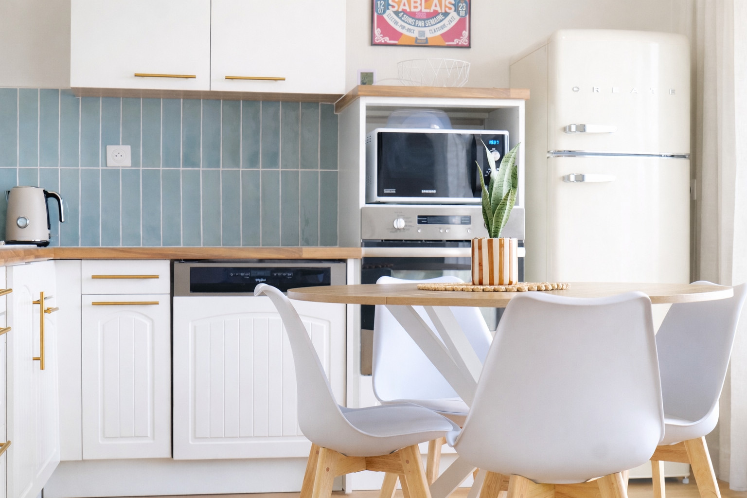 • Cuisine ouverte, équipée : four, réfrigérateur, bouilloire, grille-pain, machine à café Barista.