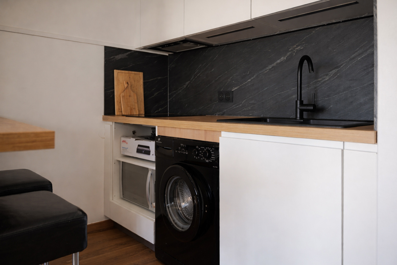 • Cuisine ouverte entièrement équipée (machine à café, bouilloire, grille-pain, micro-onde, four, machine à laver)