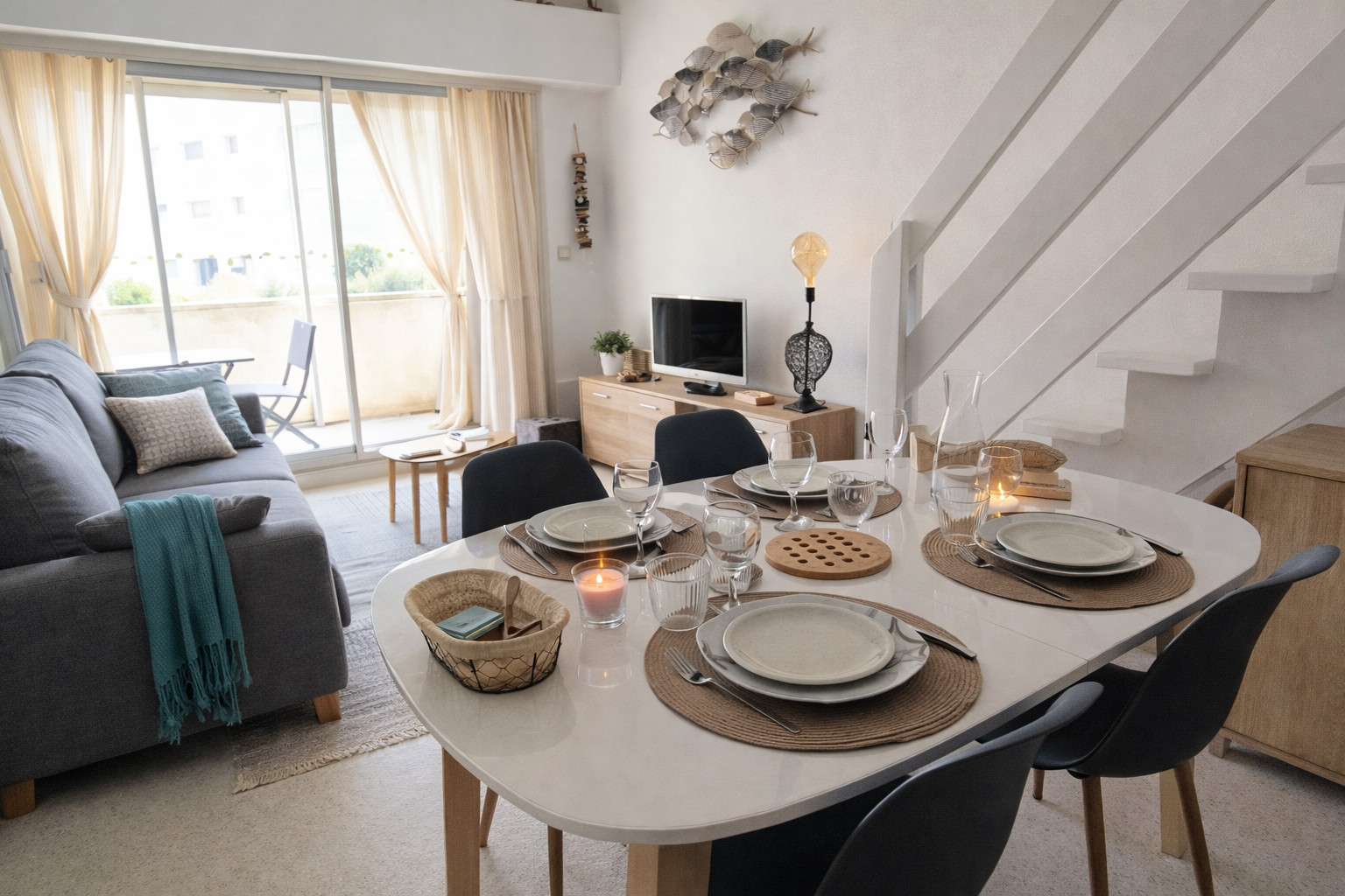 • Salon-séjour avec canapé-lit 140 cm, TV, table, chaises, table basse. Accès balcon fermé avec table et chaises.