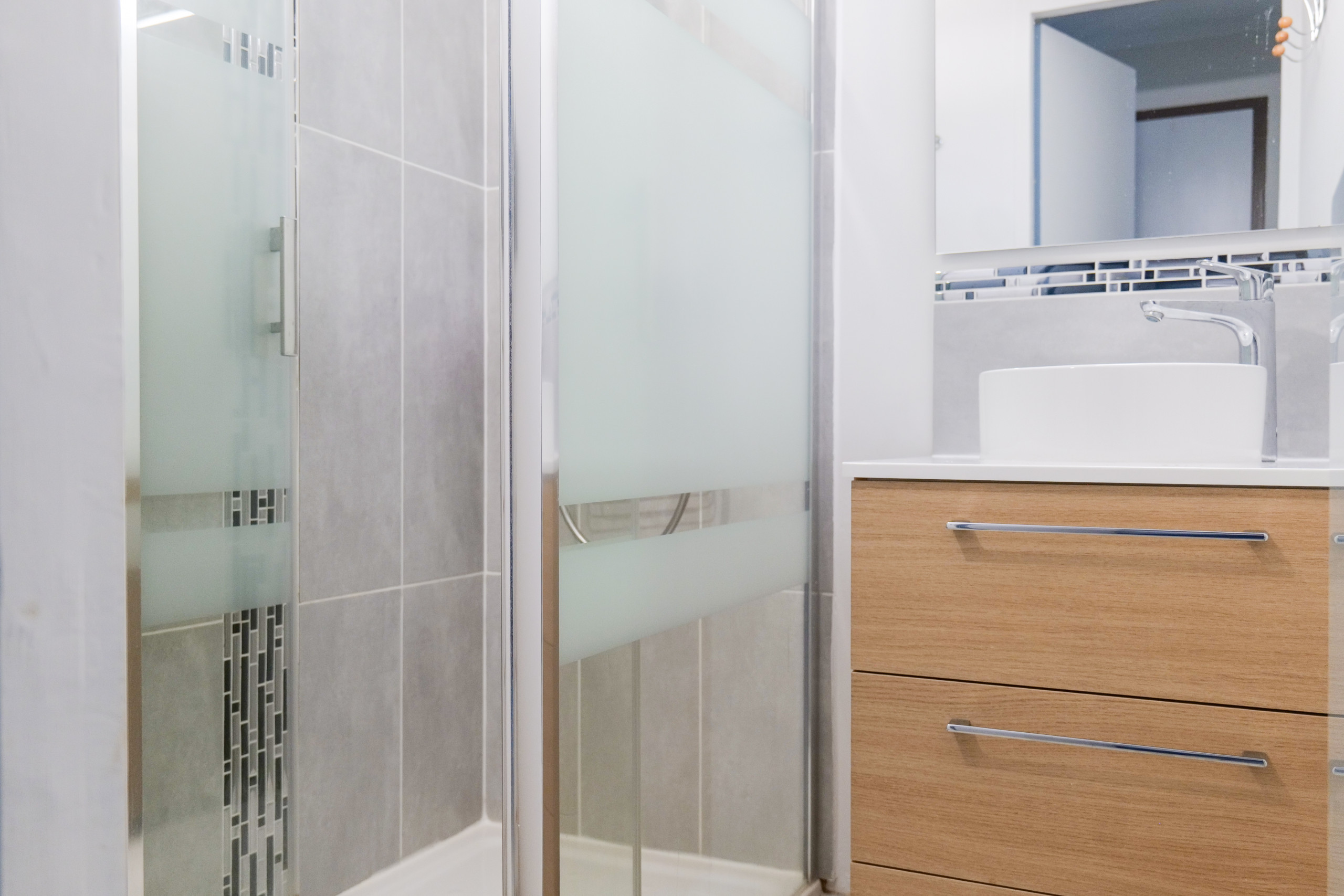 Une salle d'eau avec douche, sèche cheveux, vasque et meuble de rangement. WC séparés.