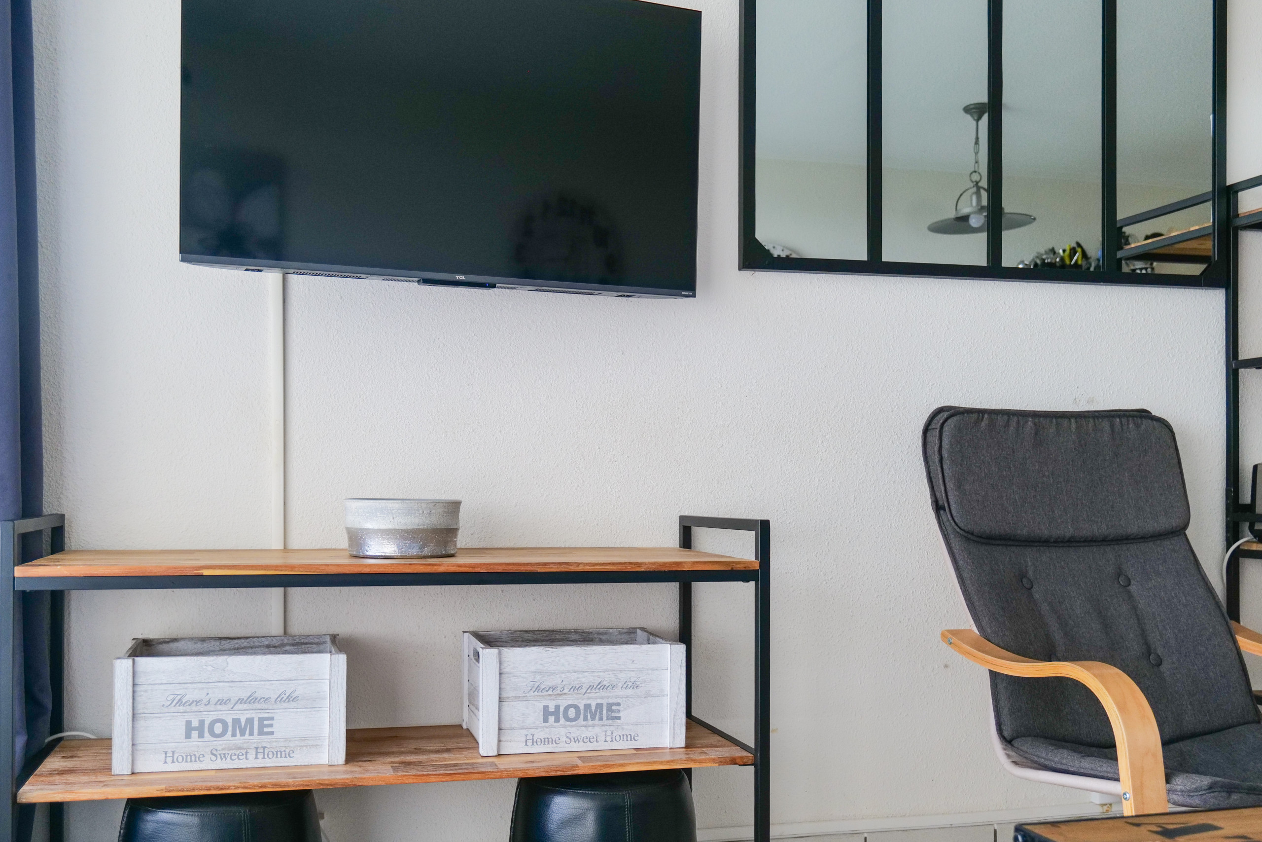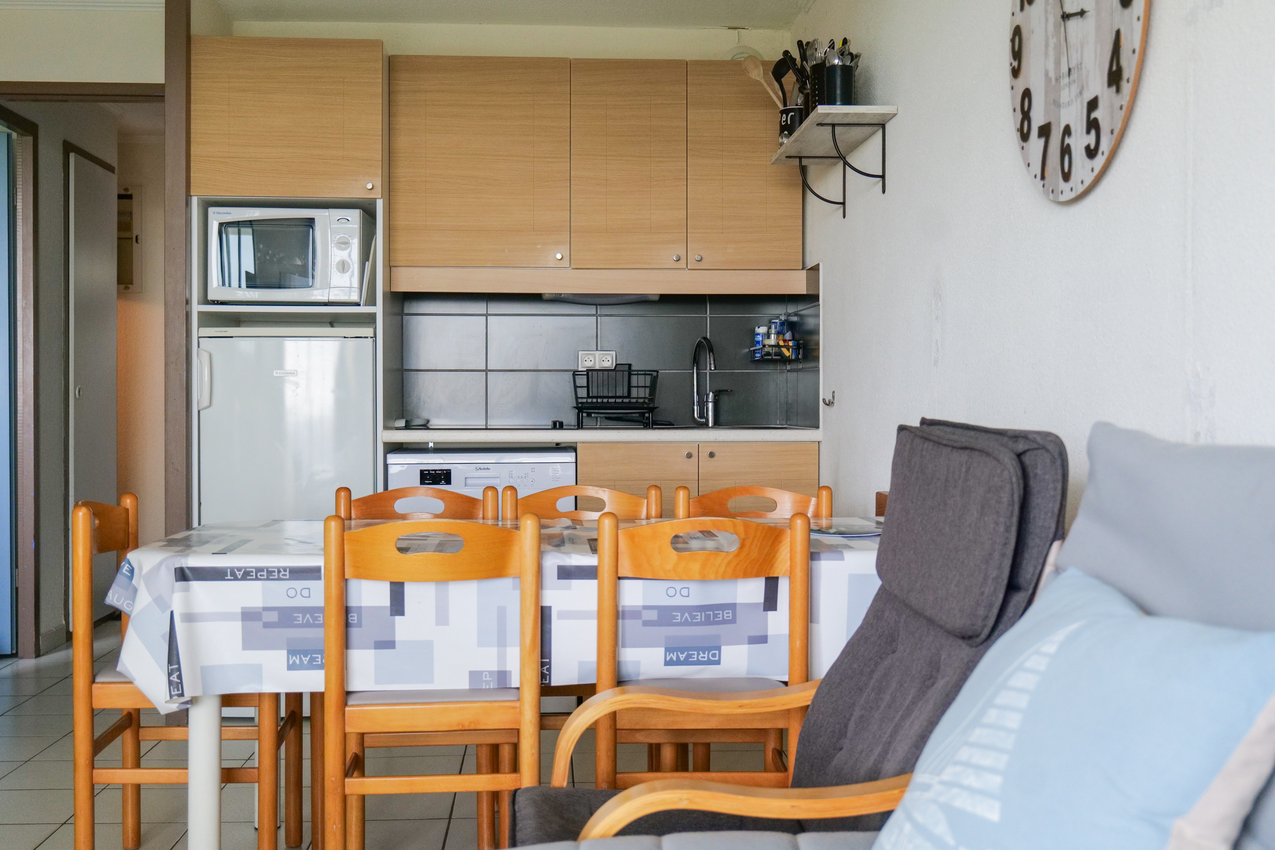 Cuisine ouverte entièrement équipée : machine à café filtre, machine Dolce Gusto, bouilloire, air fryer, micro-ondes, lave-vaisselle, grille-pain, réfrigérateur. Un séjour lumineux avec une télévision et table à manger.