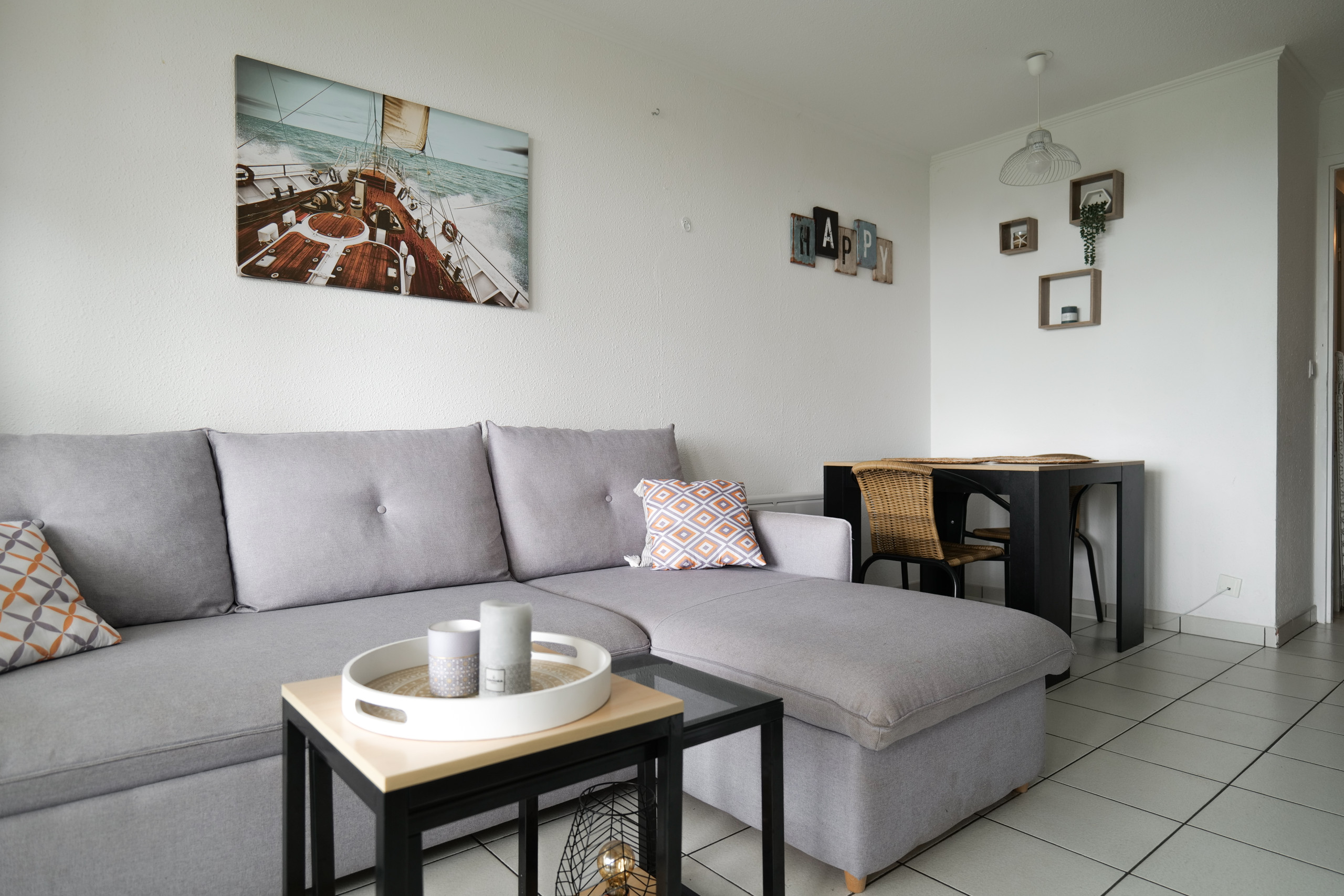 • Une pièce principale lumineuse avec canapé-lit convertible (140 cm), espace repas et TV.