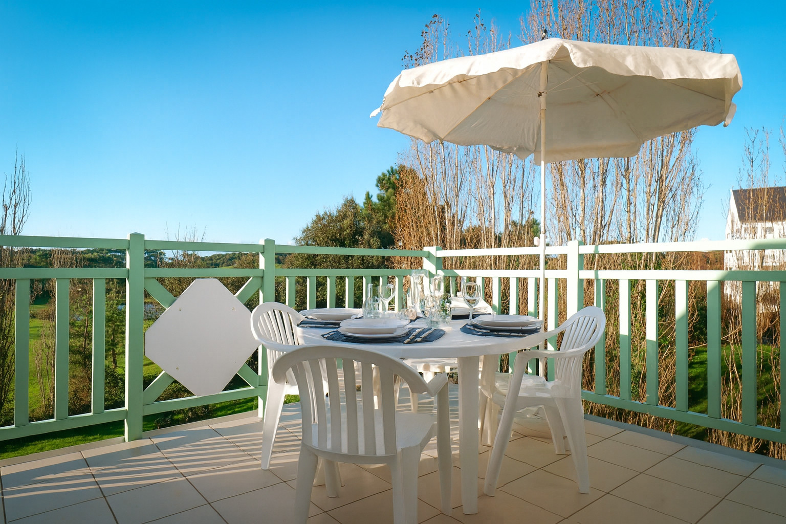 Terrasse avec salon de jardin, vue sur le terrain de golf, plancha