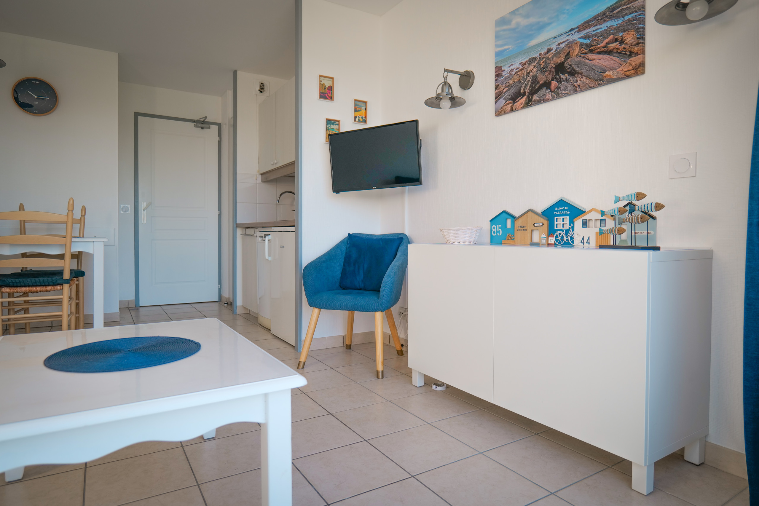 • Une pièce principale lumineuse avec canapé-lit convertible (140 cm), espace repas et TV.