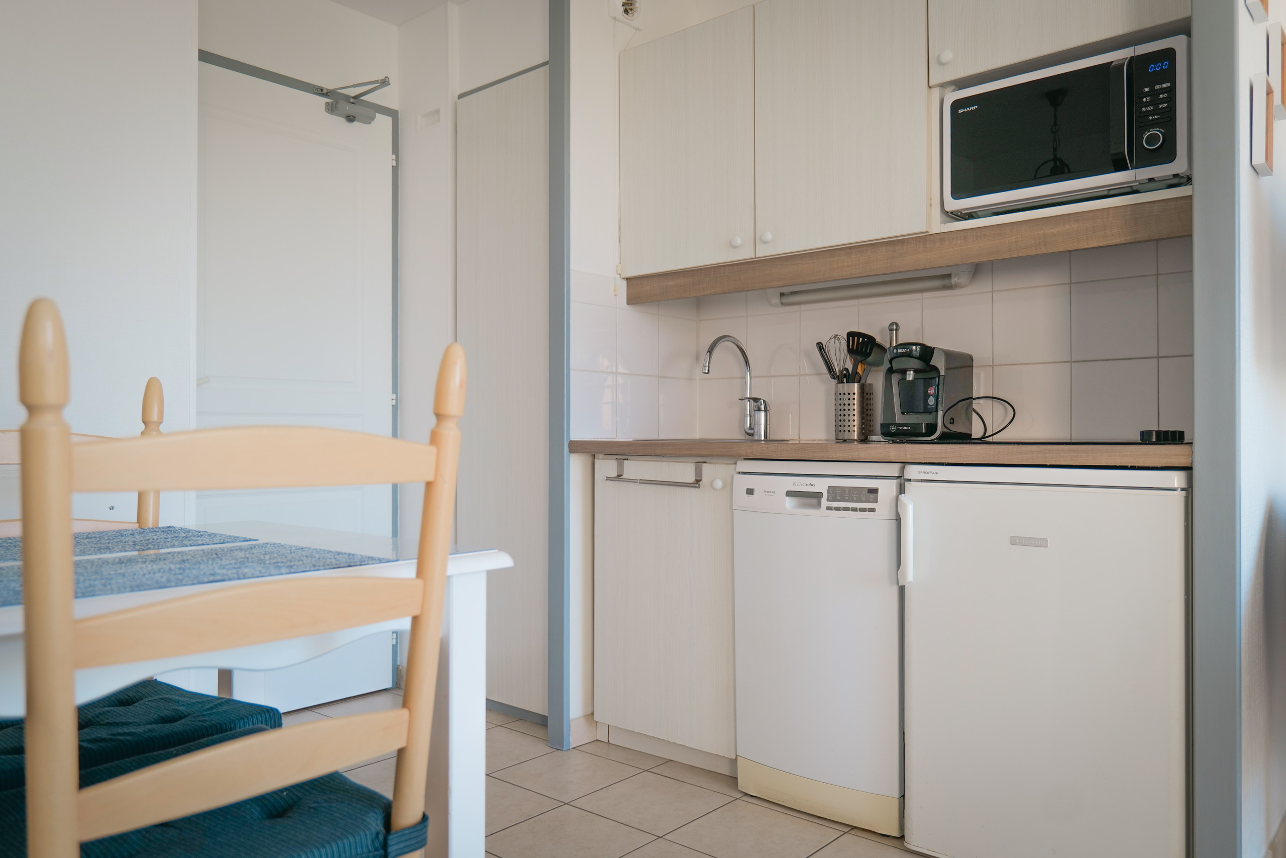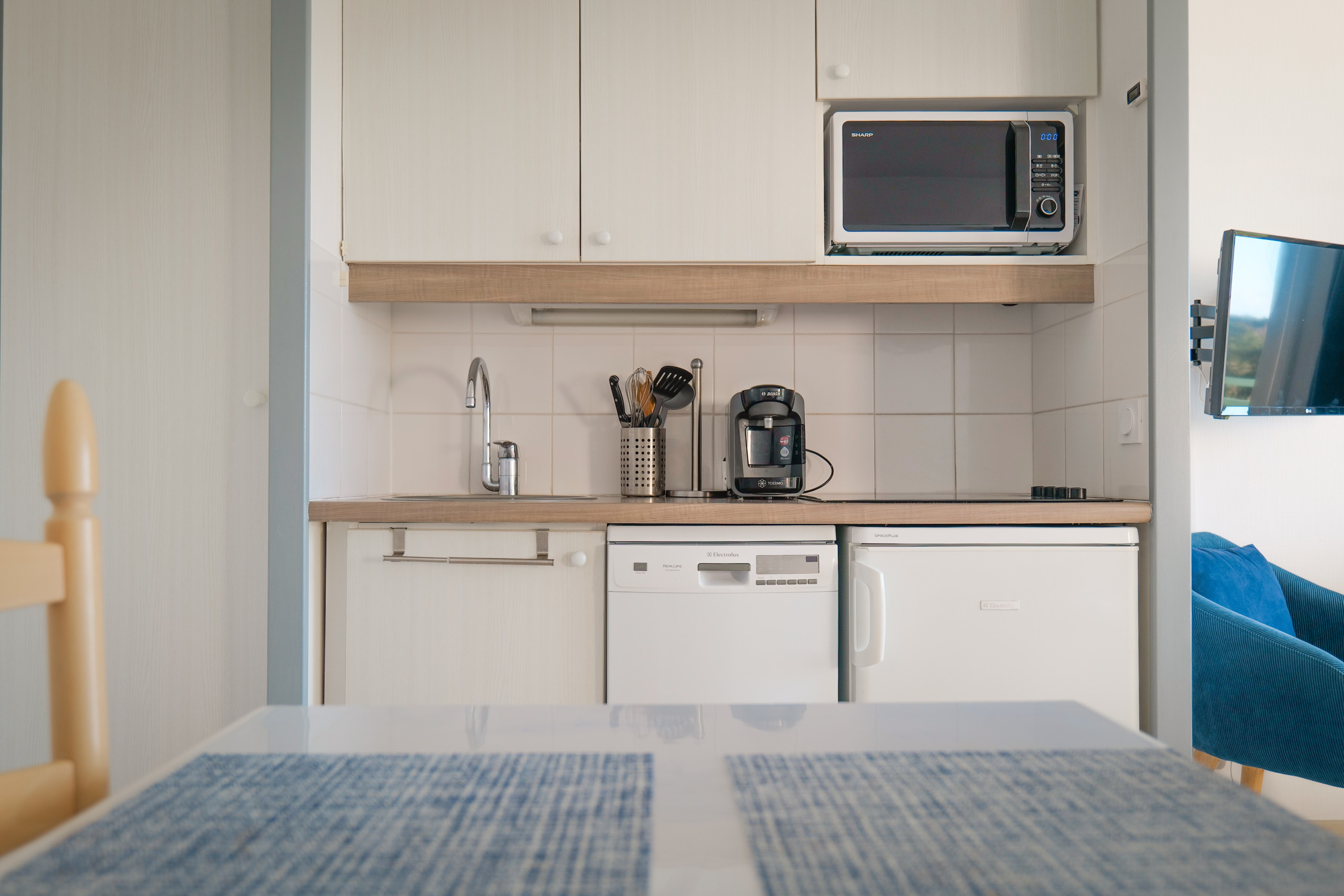 • Une cuisine ouverte et fonctionnelle : micro-ondes, bouilloire, grille-pain, réfrigérateur, cafetière (Senseo), vaisselle complète.