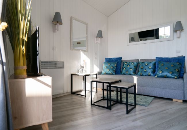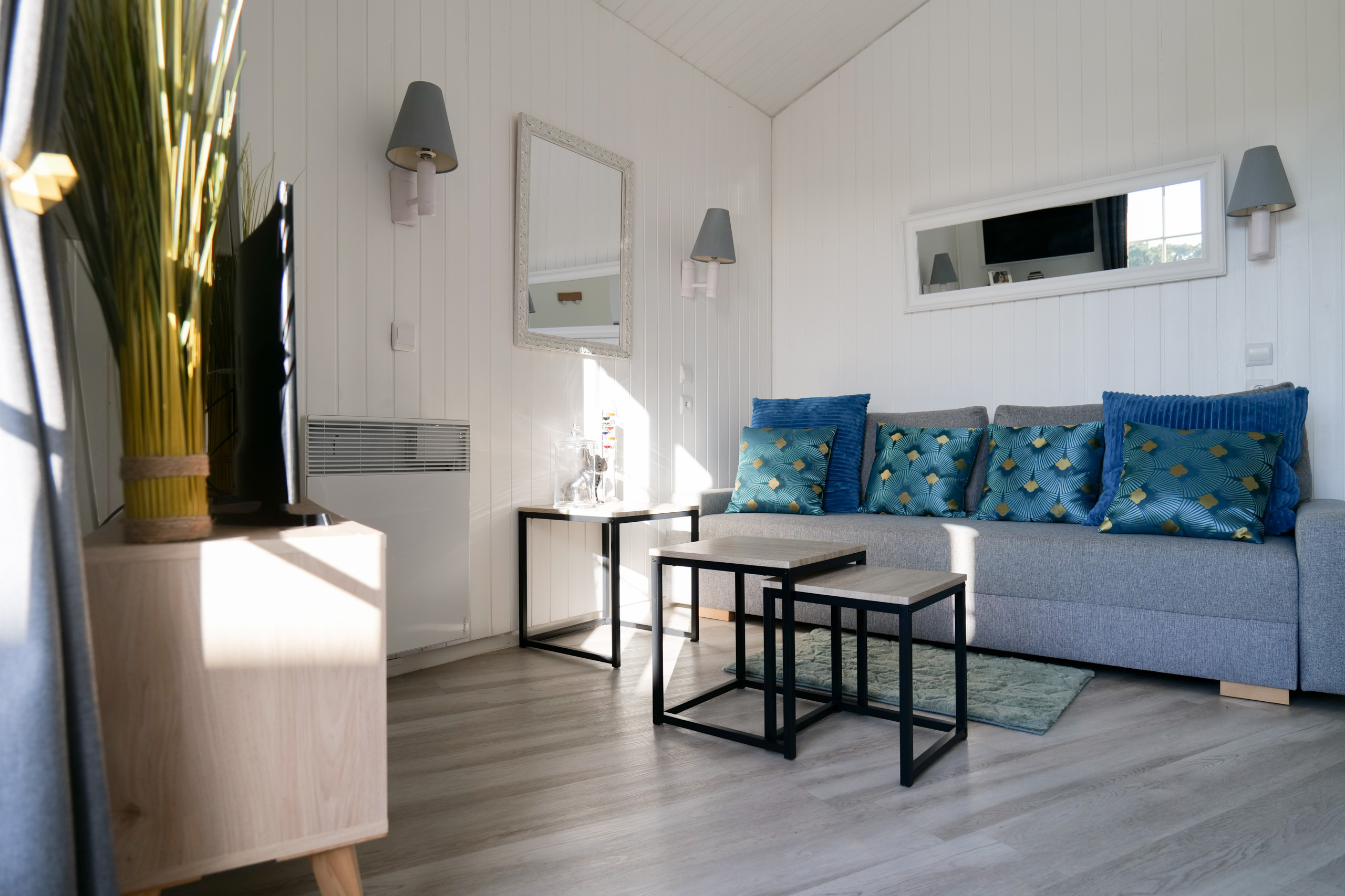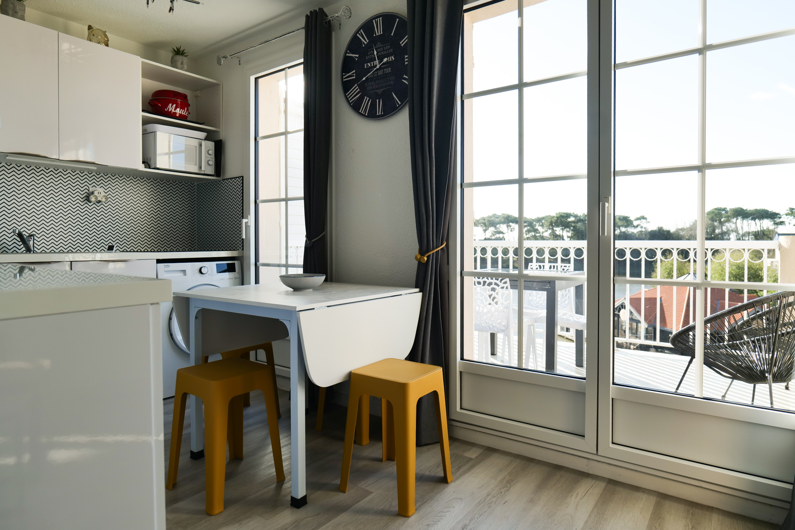 • Une pièce principale lumineuse avec canapé-lit convertible (140 cm), espace repas et TV.