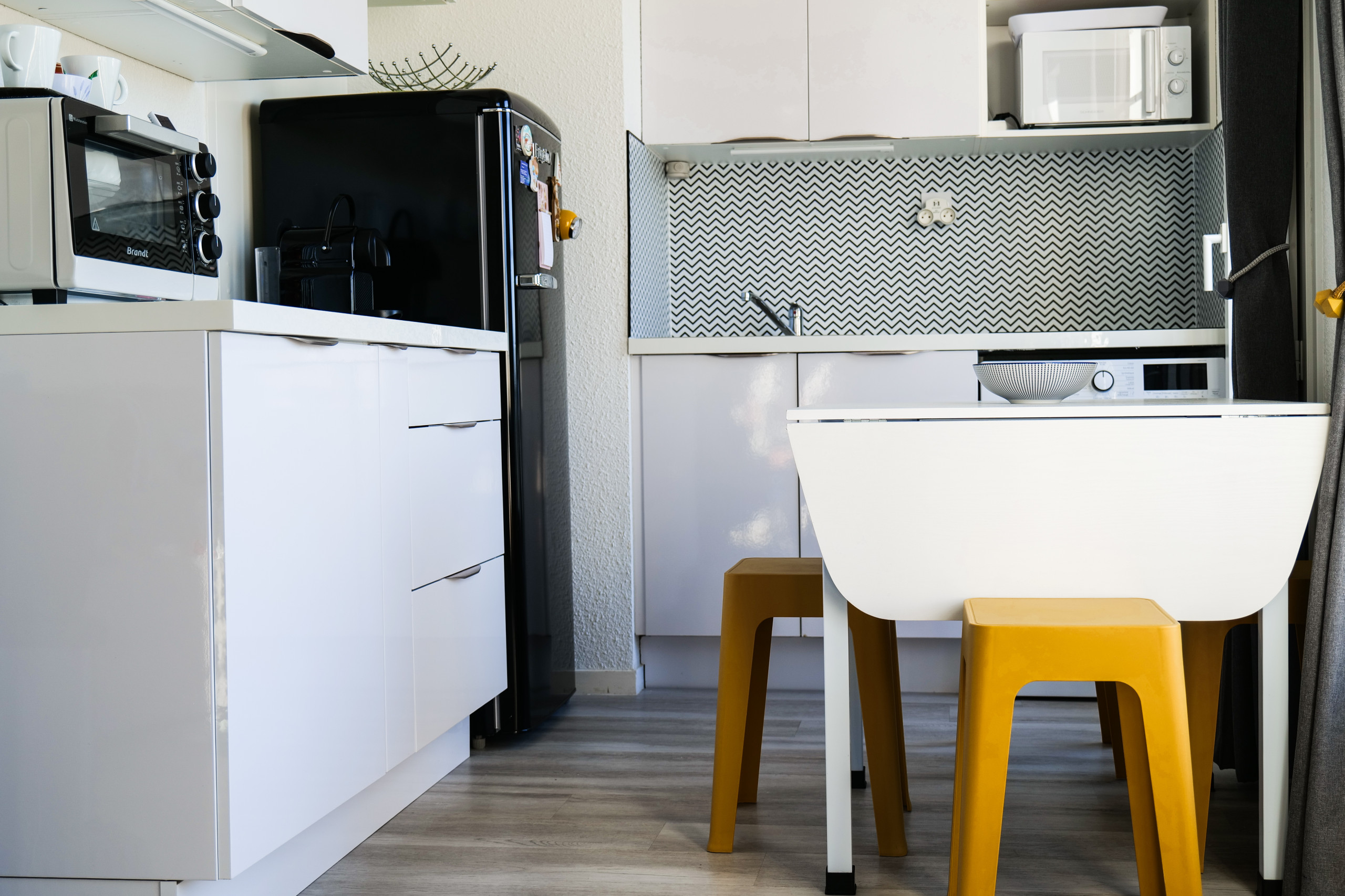 • Une cuisine ouverte et fonctionnelle : micro-ondes, bouilloire, grille-pain, réfrigérateur, cafetière (Senseo), vaisselle complète.