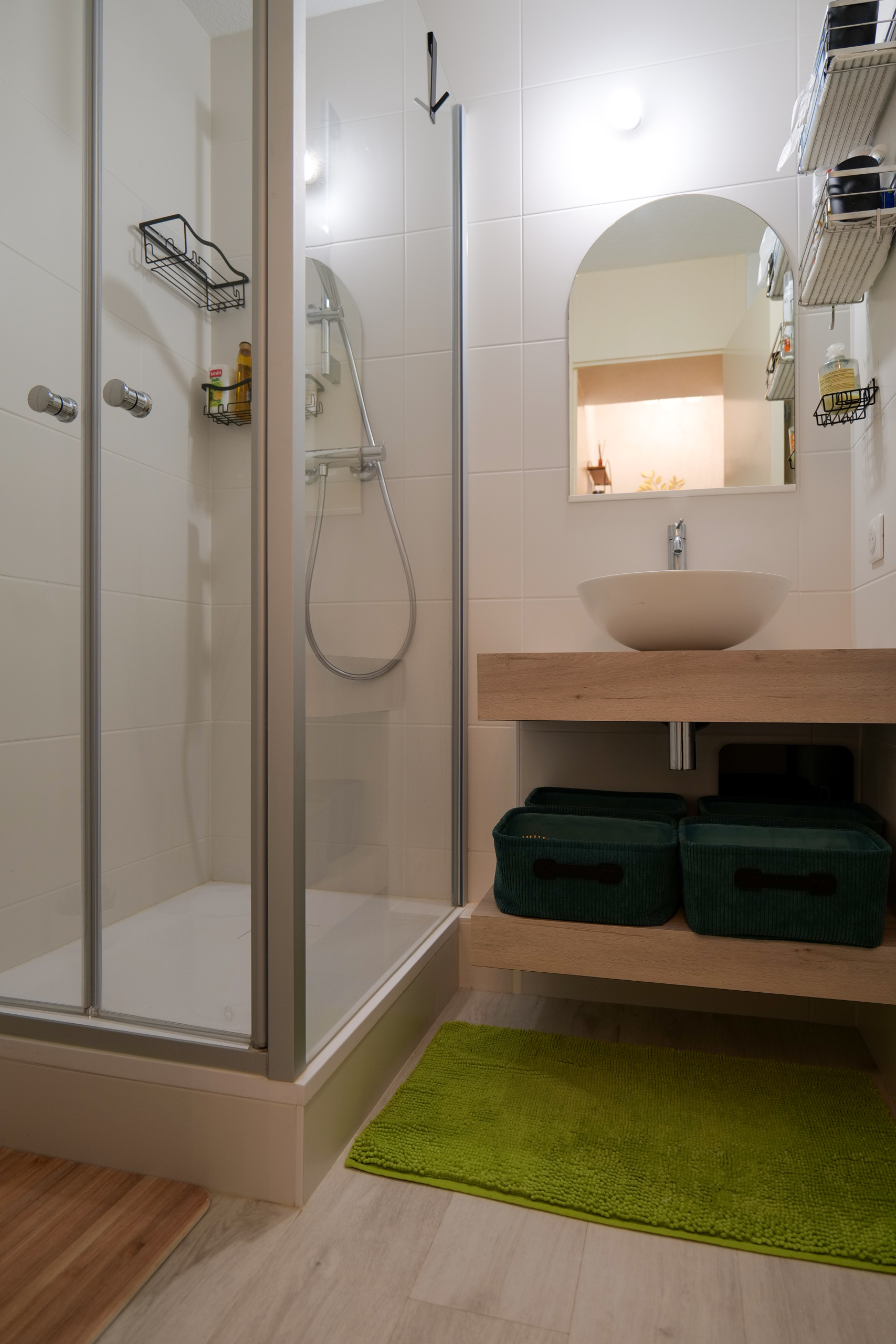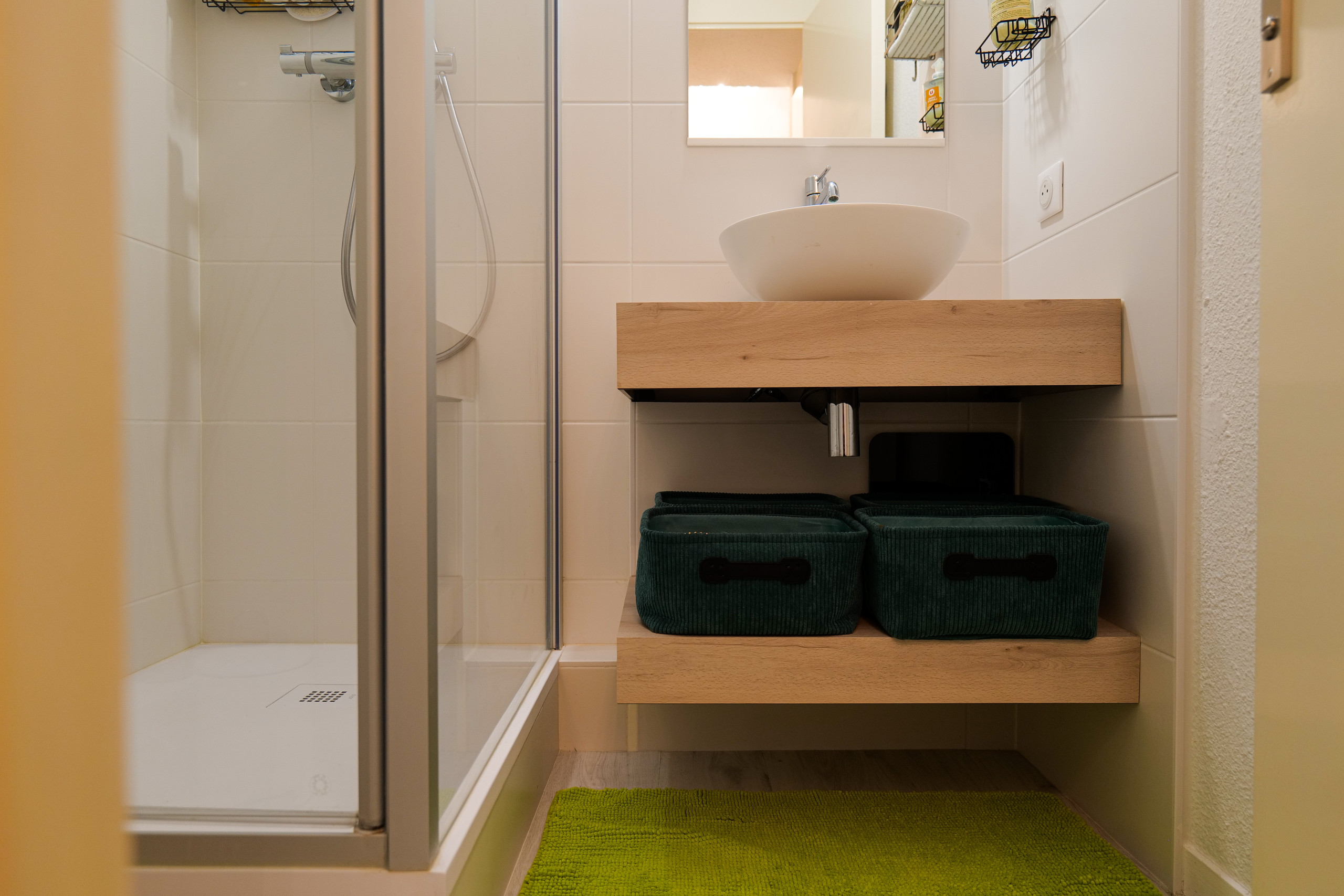 Salle d’eau rénovée avec douche, vasque et meuble de rangement.