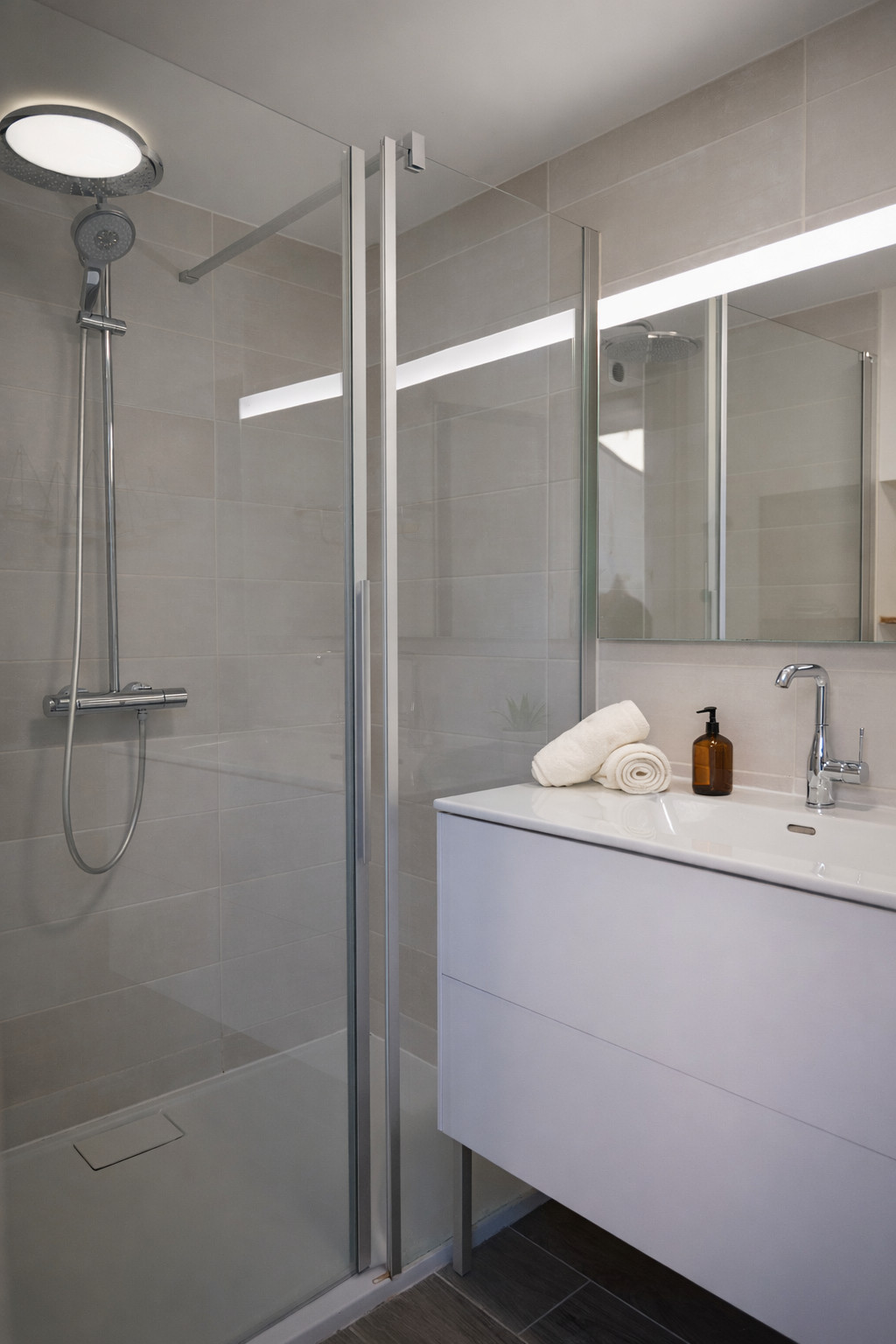 - Salle de bain avec deux douches à l’italienne et double vasque.