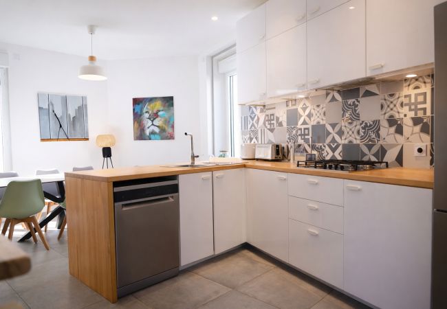 • Cuisine équipée et ouverte sur la pièce de vie : réfrigérateur, four, plaques de cuisson induction, lave-vaisselle, cafetière, bouilloire, grille-pain