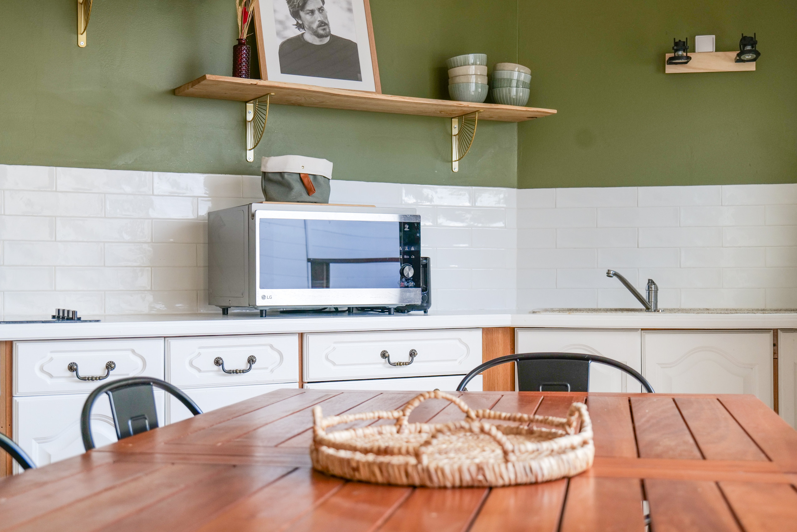 • Cuisine ouverte équipée : micro-ondes, four, grille-pain, cafetière, lave-vaisselle, réfrigérateur et congélateur