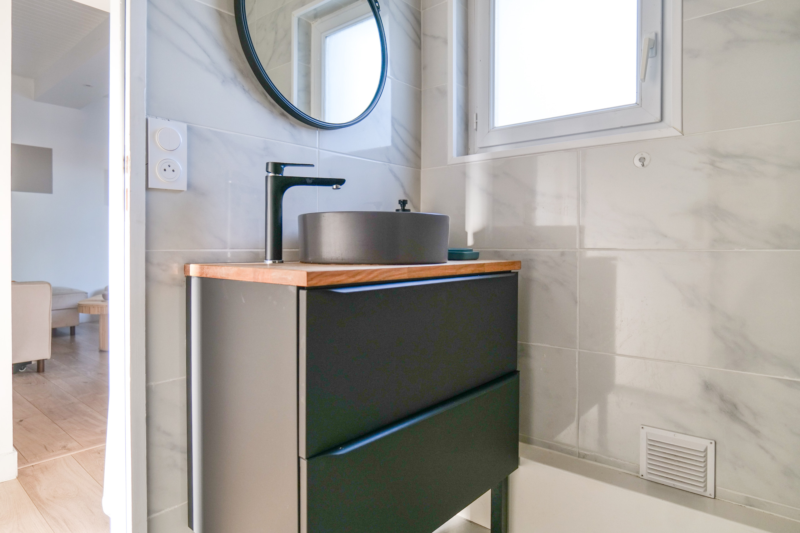 • Salle d’eau avec cabine de douche, meuble vasque, sèche-serviettes et WC