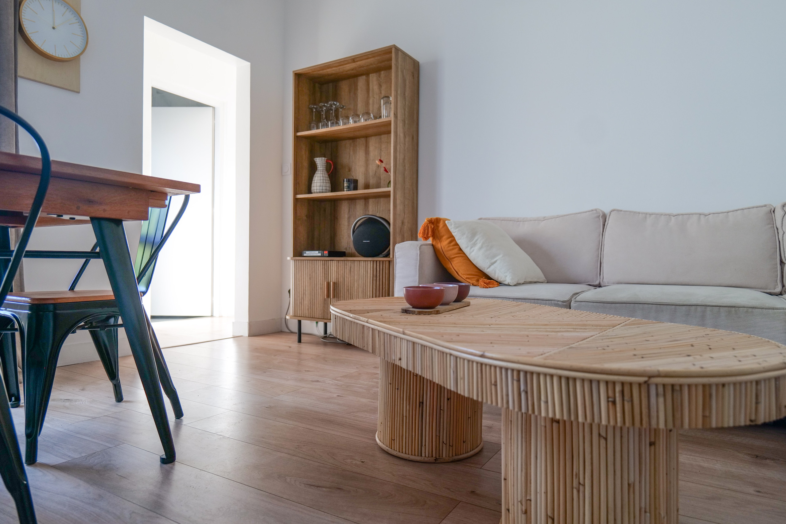 • D’un salon-séjour lumineux, équipé d’un canapé, d’une table basse et d’un espace repas.
