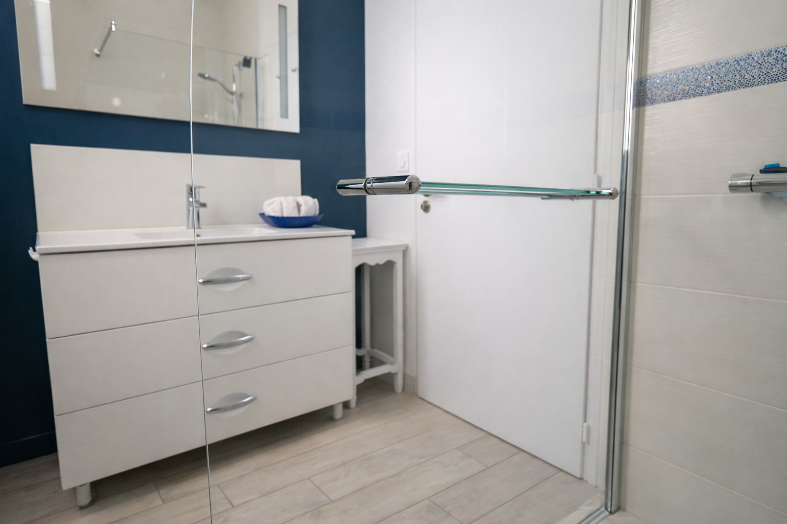 • Salle d’eau avec cabine de douche, meuble vasque, sèche-serviettes et WC