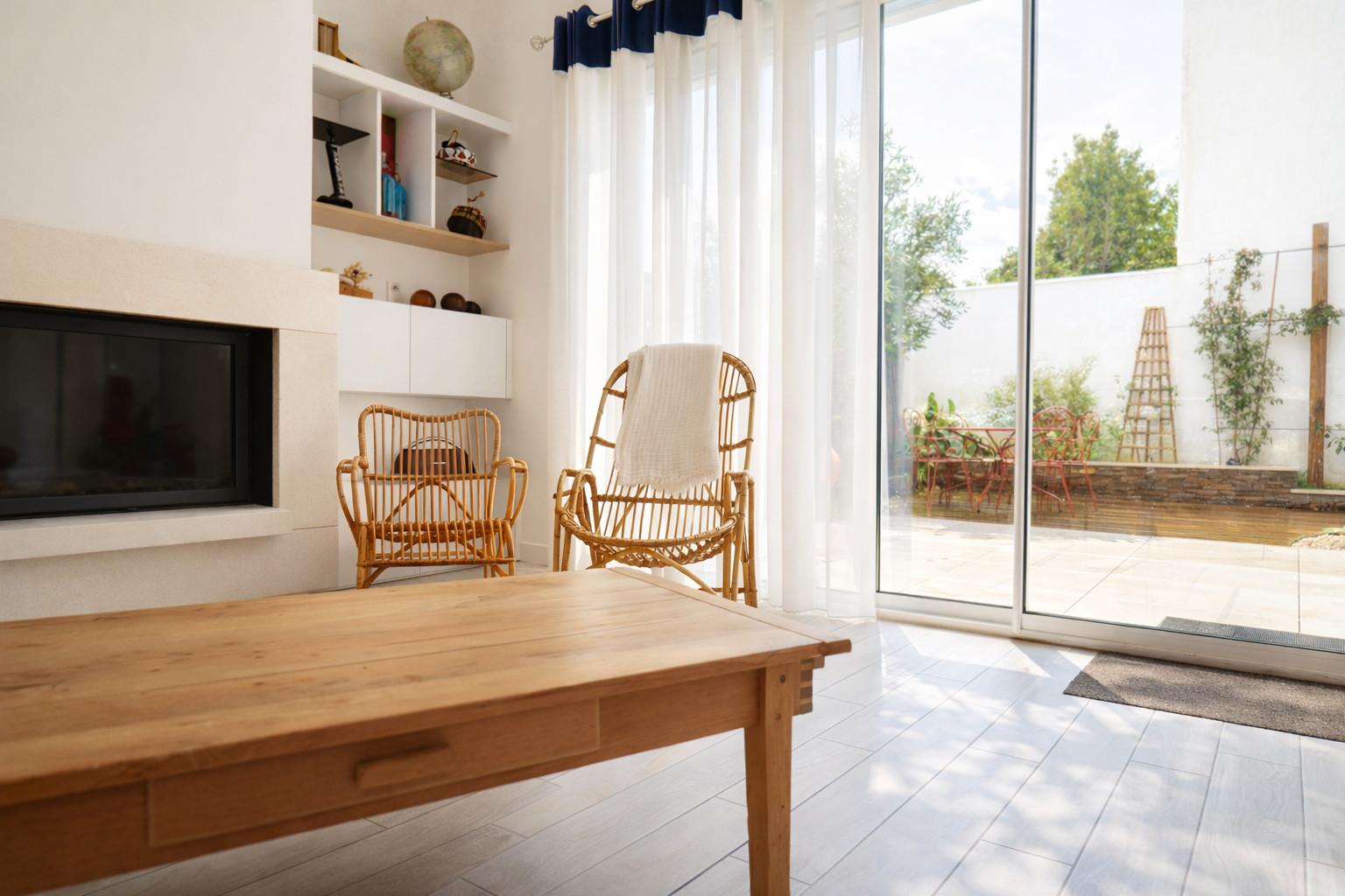 Grand salon ouvert, canapé confortable, télévision, Wifi, accès direct à la terrasse.