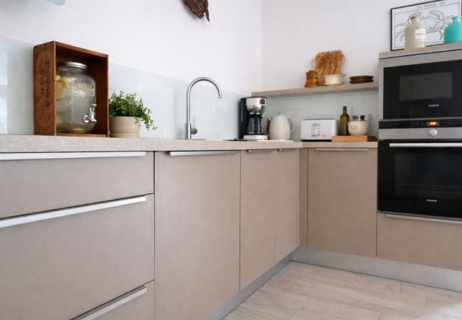 • Cuisine ouverte équipée : micro-ondes, four, grille-pain, cafetière, lave-vaisselle, réfrigérateur et congélateur
