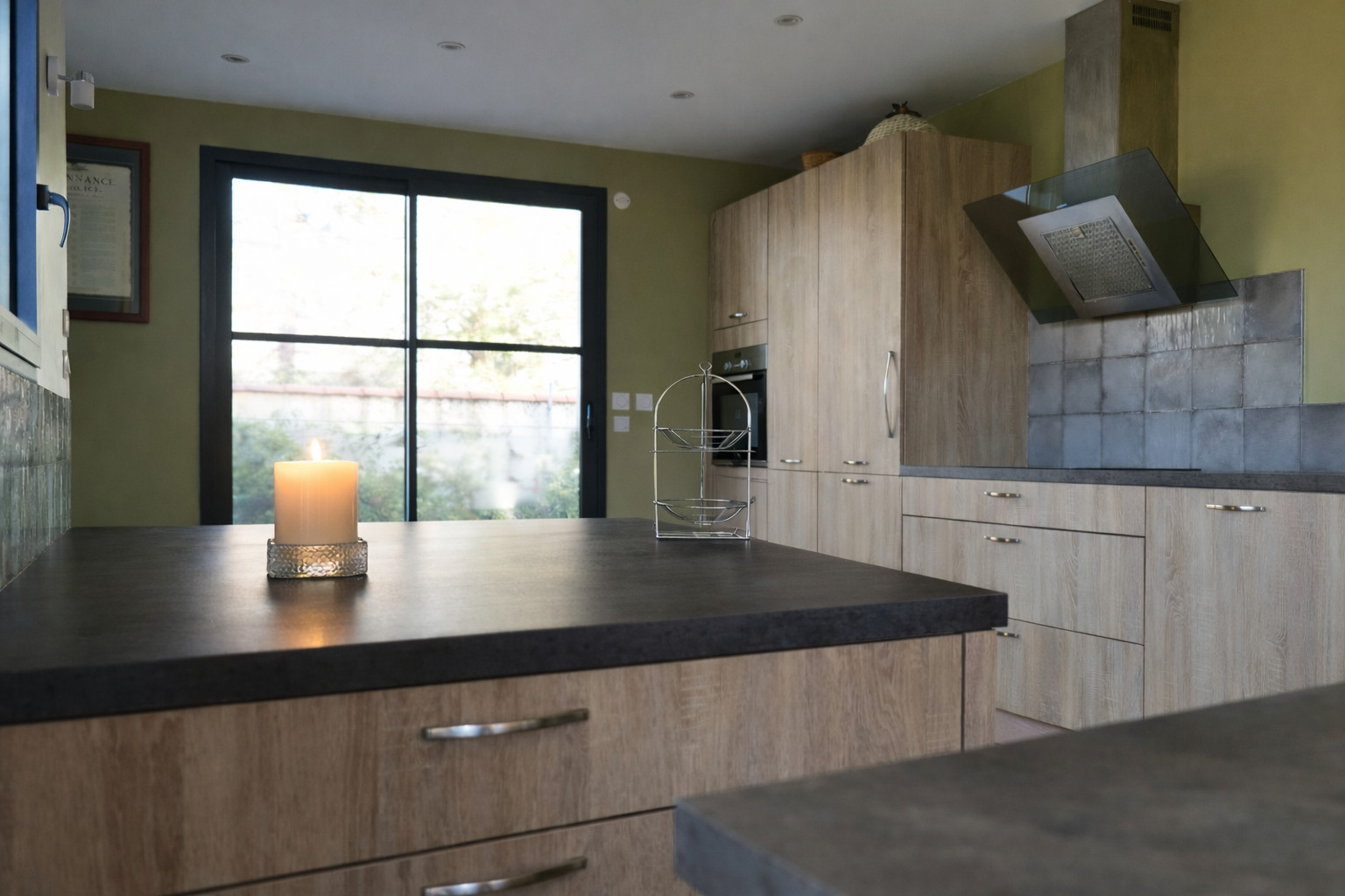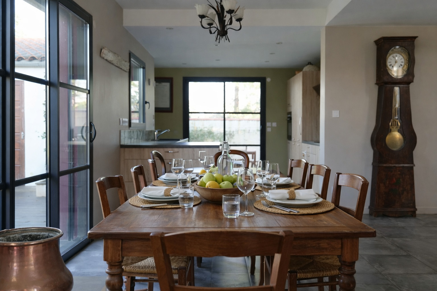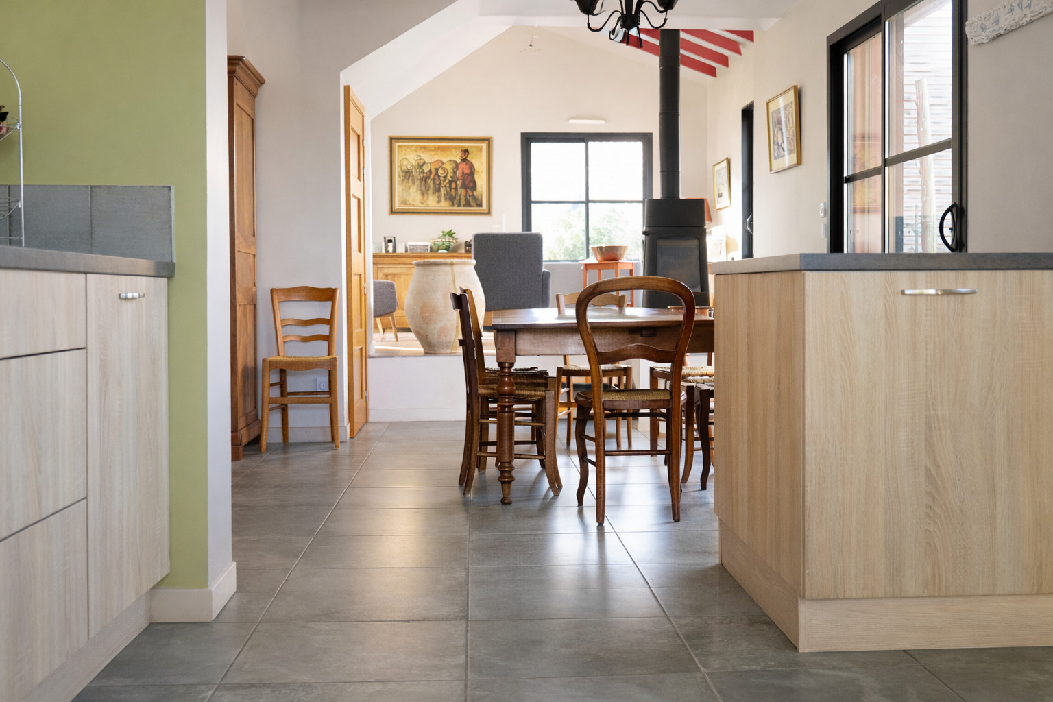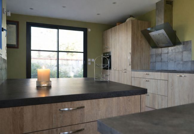 Cuisine aménagée et équipée, ouverte sur la pièce de vie : réfrigérateur, congélateur, four, cafetière Nespresso + cafetière filtre, bouilloire, grille pain, lave vaisselle...