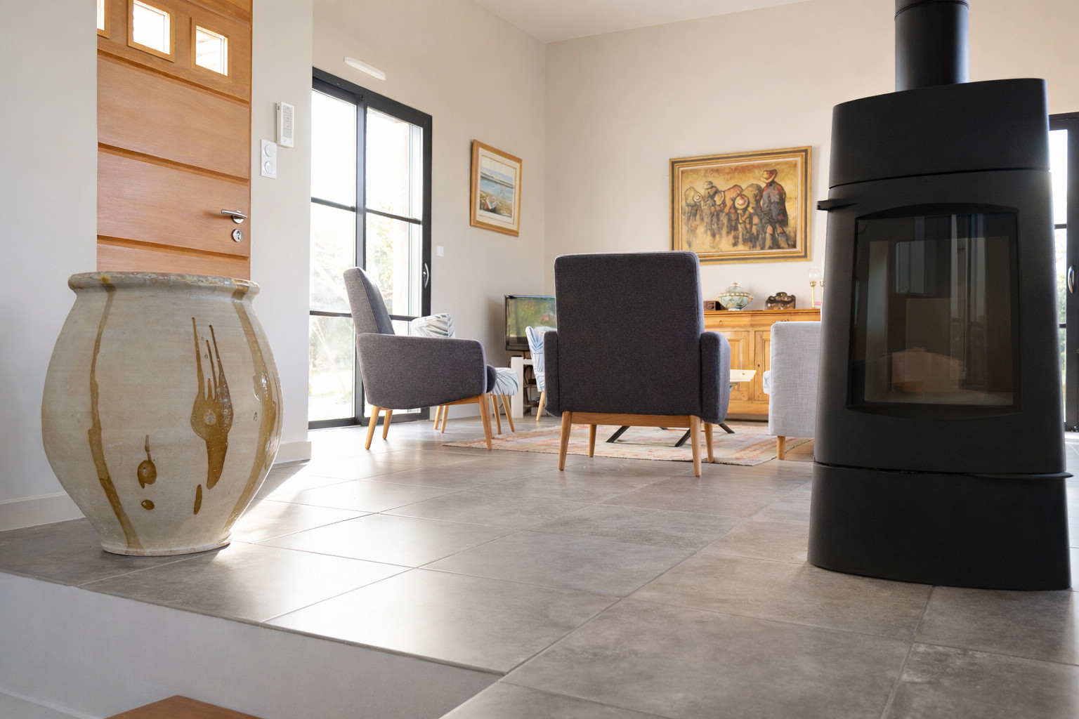 Pièce de vie conviviale et spacieuse avec espace repas et coin salon, TV et Wifi.