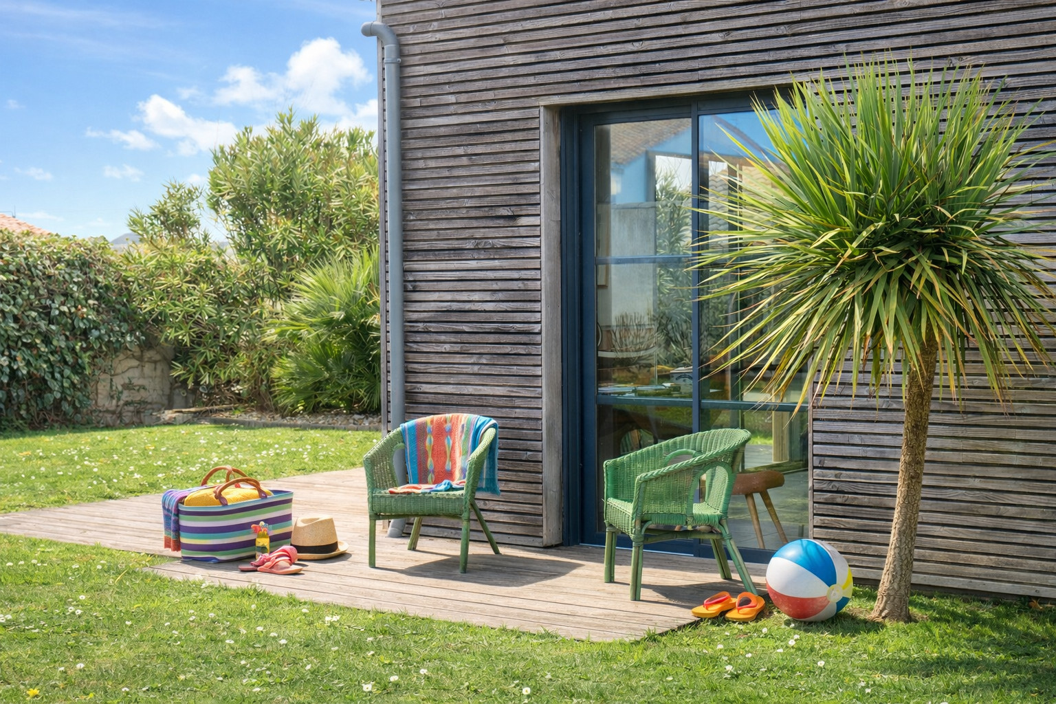 Atout du logement : patio avec grandes ouvertures donnant directement sur l'extérieur vous permettant de déjeuner à l'abri, vous profiterez d'un magnifique jardin au calme, entièrement clos et arboré, plusieurs terrasses avec salon de jardin et transat pour profiter du soleil.