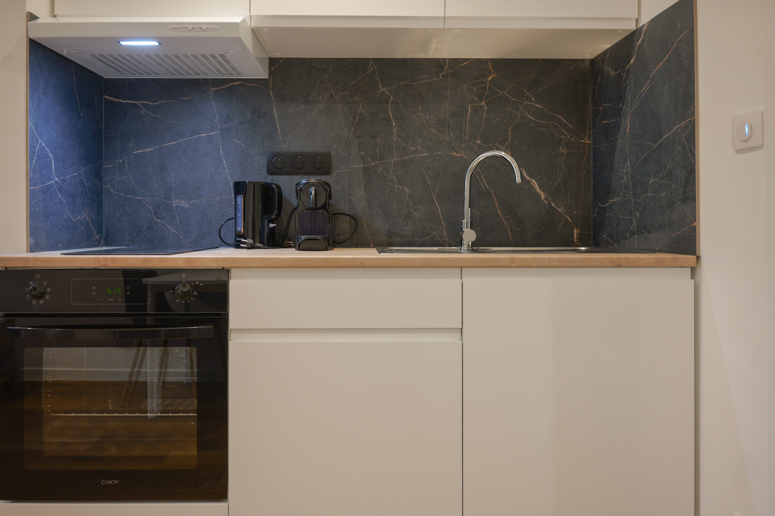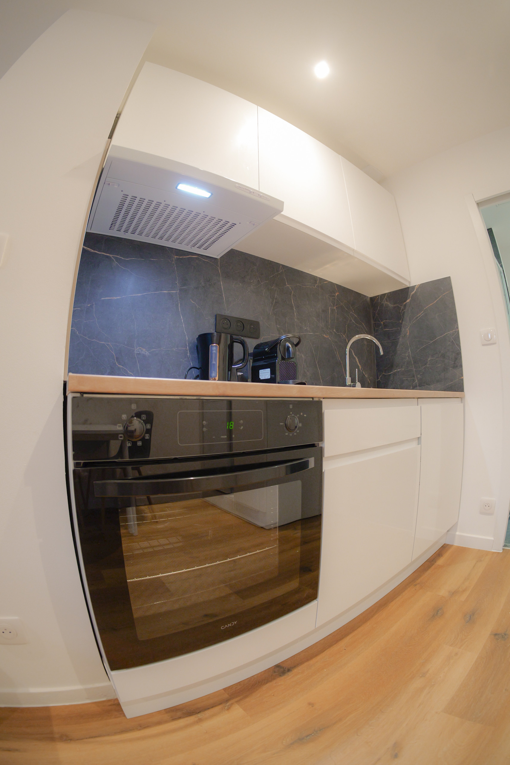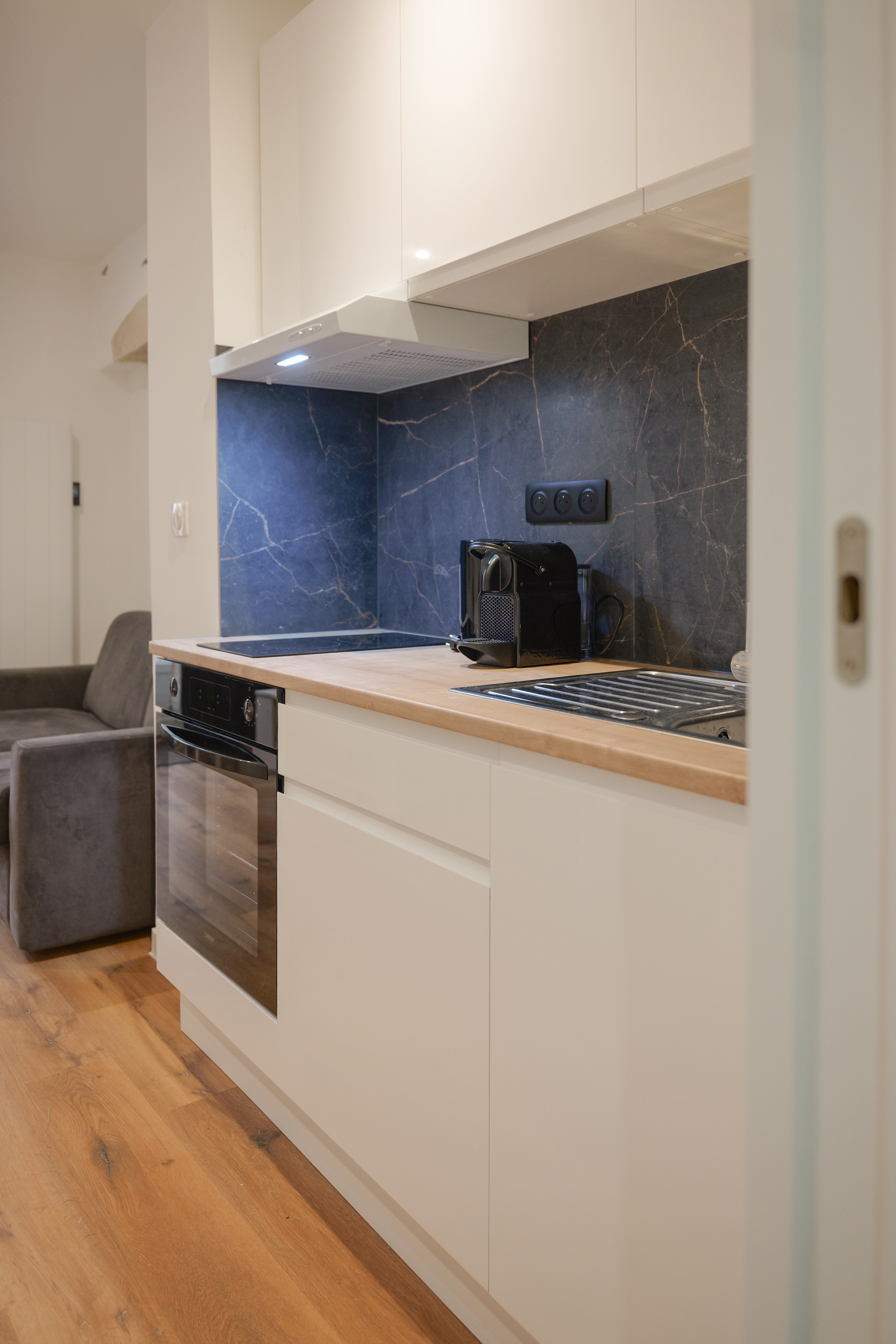 • Cuisine américaine équipée : plaques à induction, réfrigerateur, four, micro-ondes, cafetière, bouilloire, grille-pain, presse-agrumes et cafetière ( NESPRESSO).