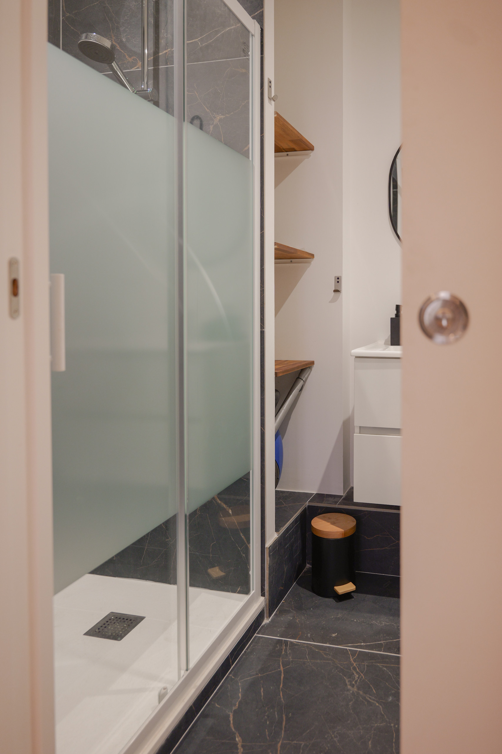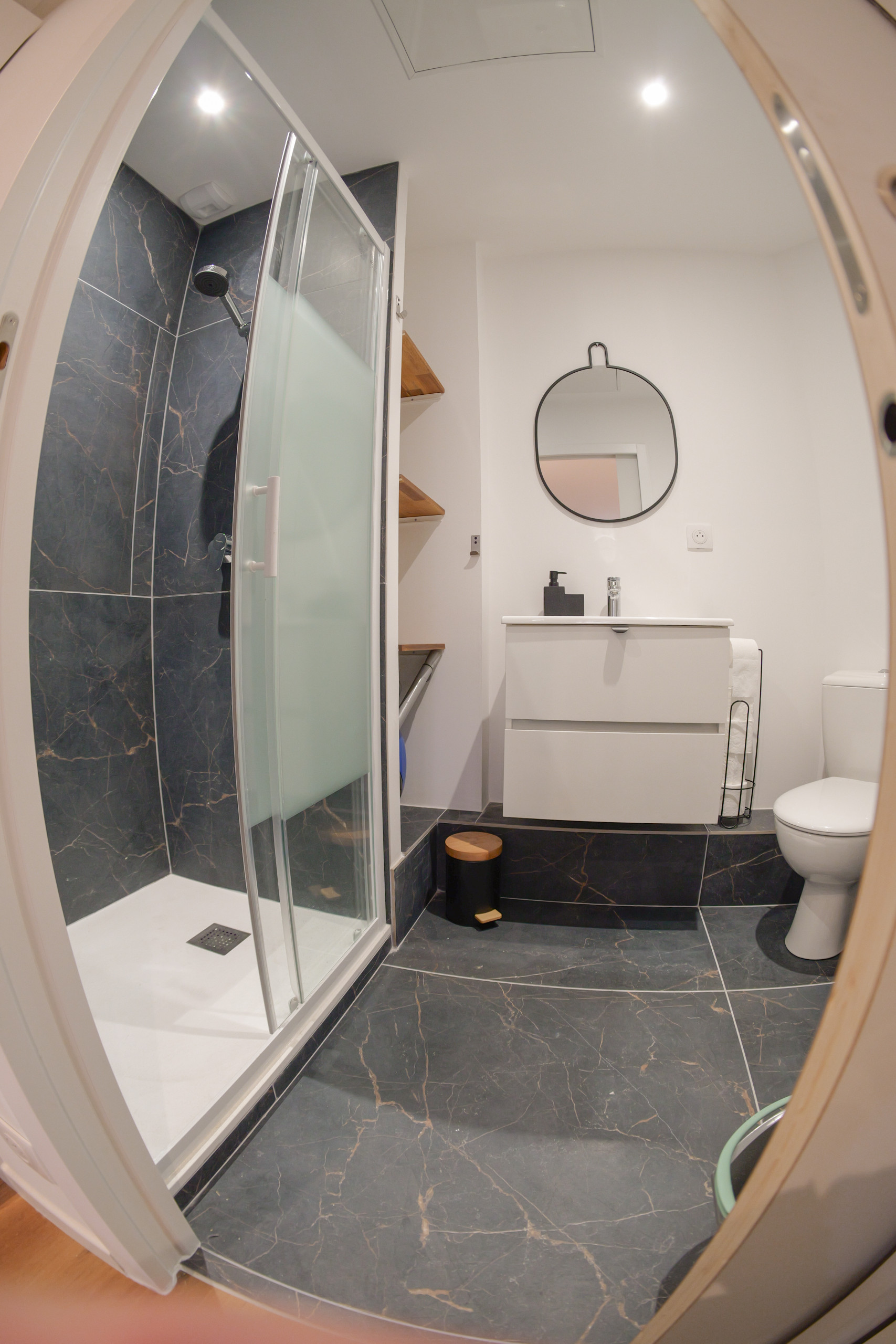 • Salle d'eau optimisée avec douche, vasque et WC.