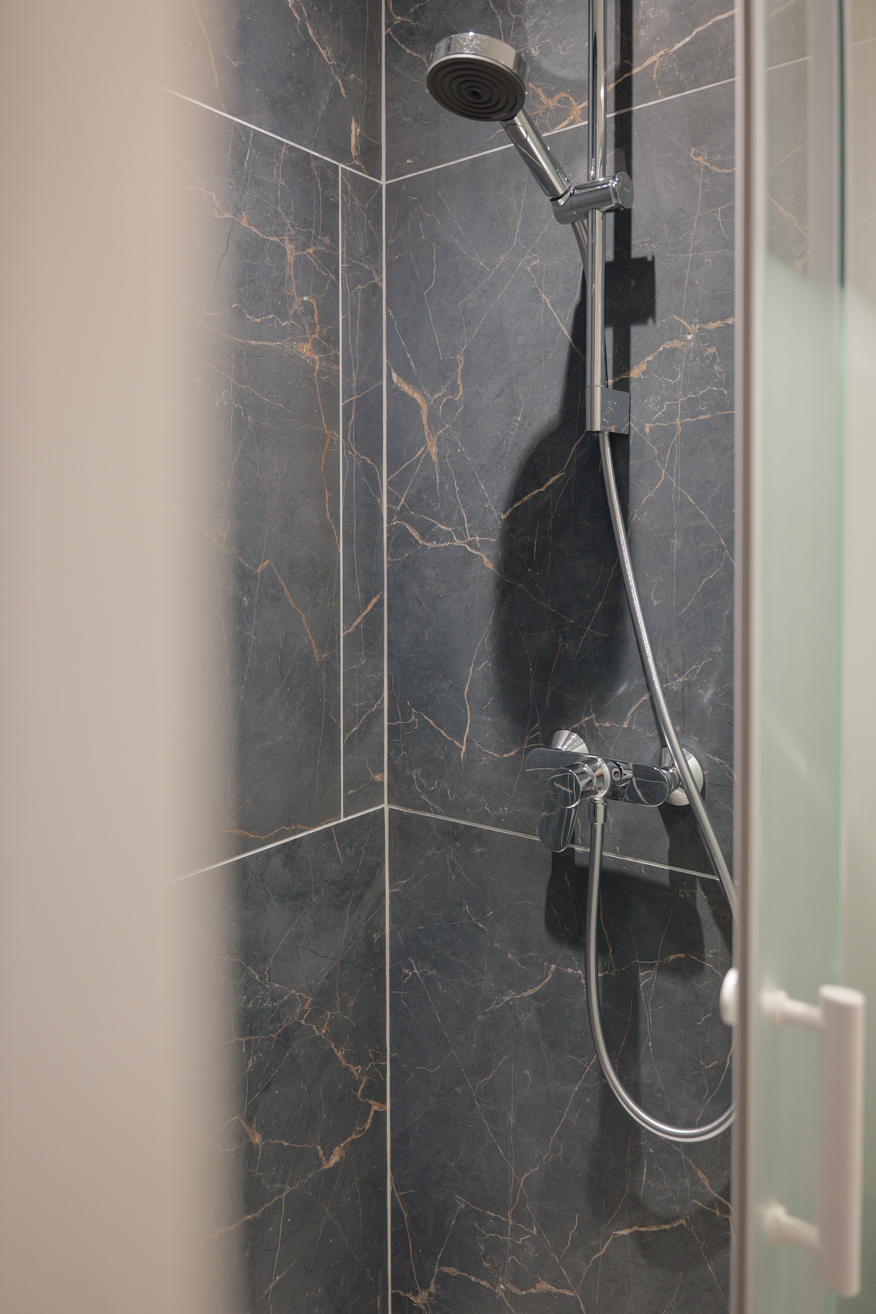 • Salle d’eau moderne : douche, vasque, machine à laver et WC.