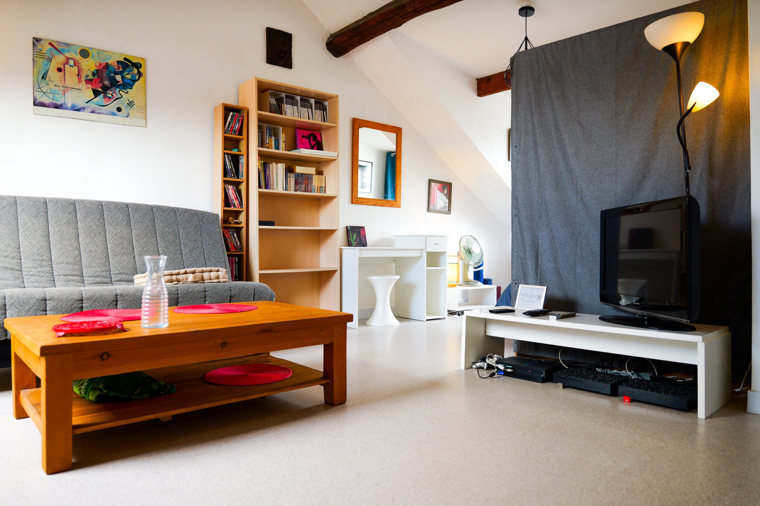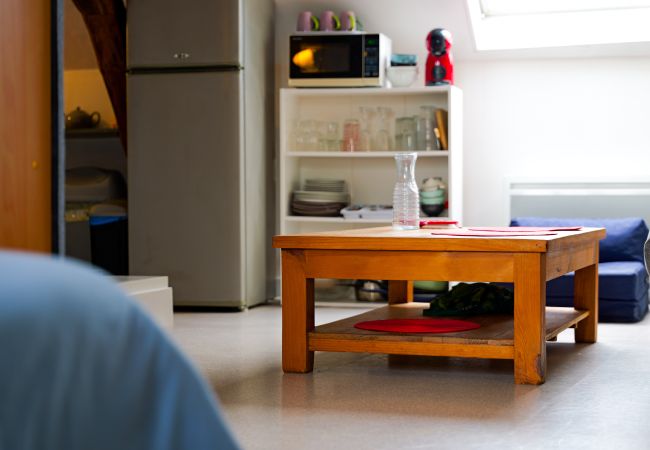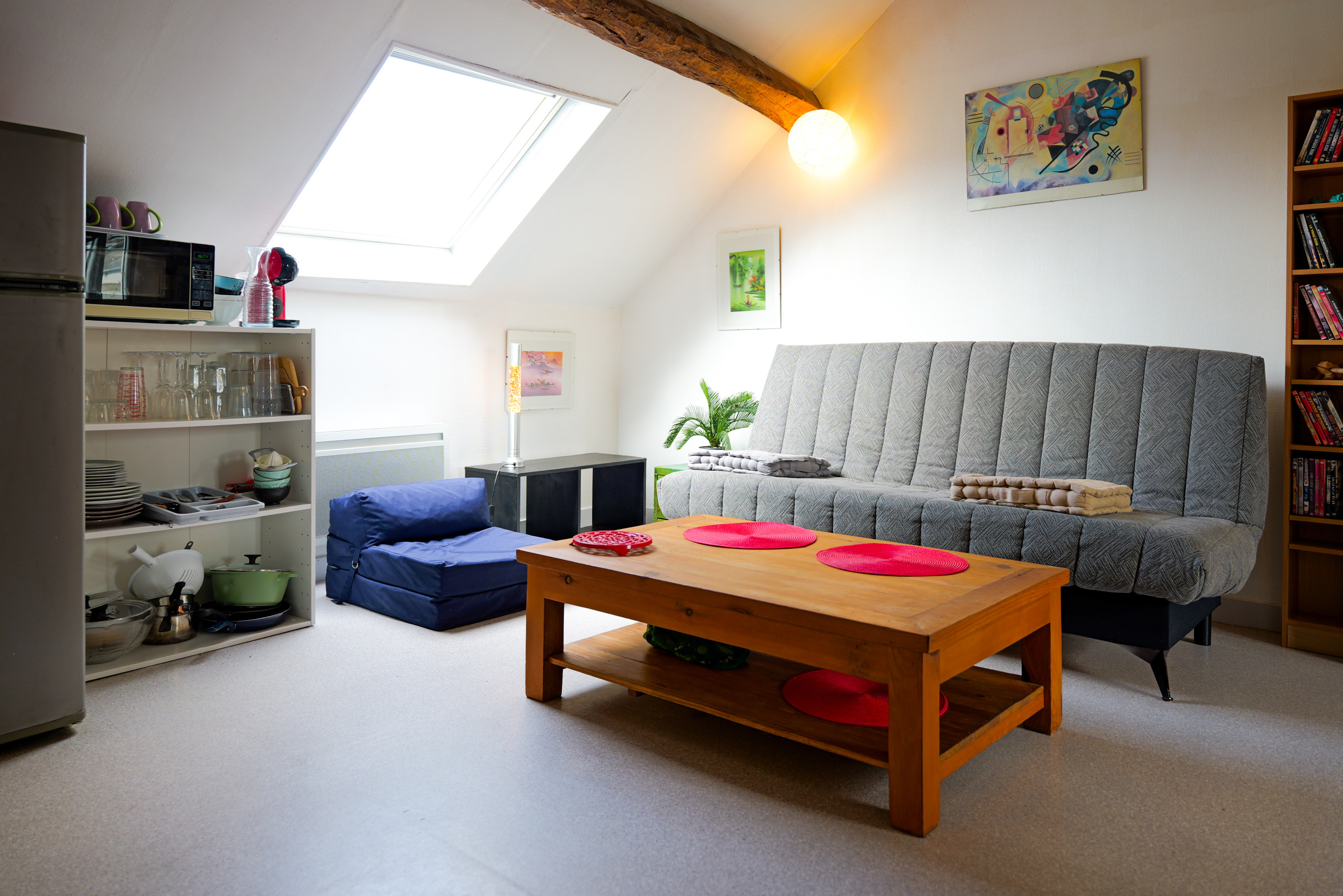 L'appartement est conçu sur deux niveaux, avec une pièce de vie en mezzanine qui surplombe le reste du logement. Cette pièce conviviale dispose d'un lit double ainsi qu'un canapé convertible en lit double pour un confort optimal. La décoration soignée et moderne crée une atmosphère apaisante, idéale pour se détendre après une journée de découverte de la ville.