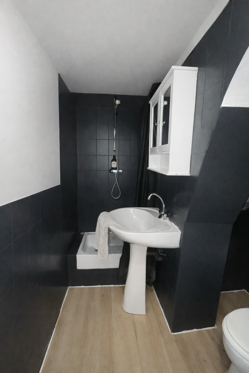 D’une salle d’eau équipée d’une cabine de douche, d’une vasque avec meuble de rangement, d’un sèche cheveux et d’un WC.