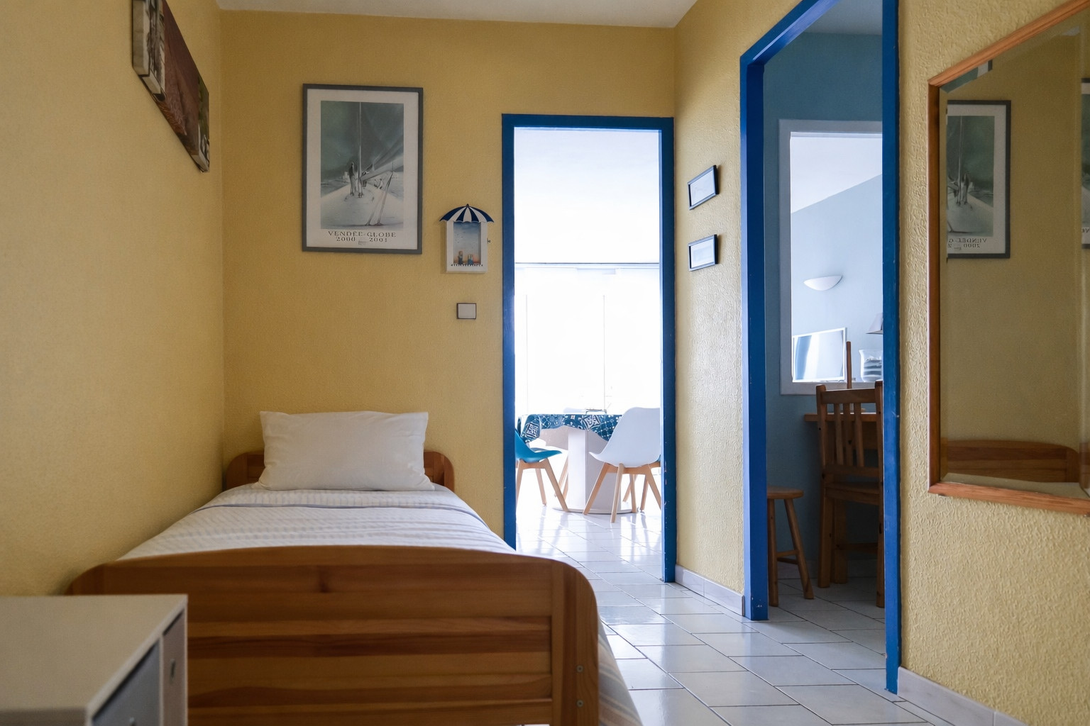 Une chambre située dans l’alcôve d’entrée, équipée d’un lit simple, offrant un espace nuit indépendant.