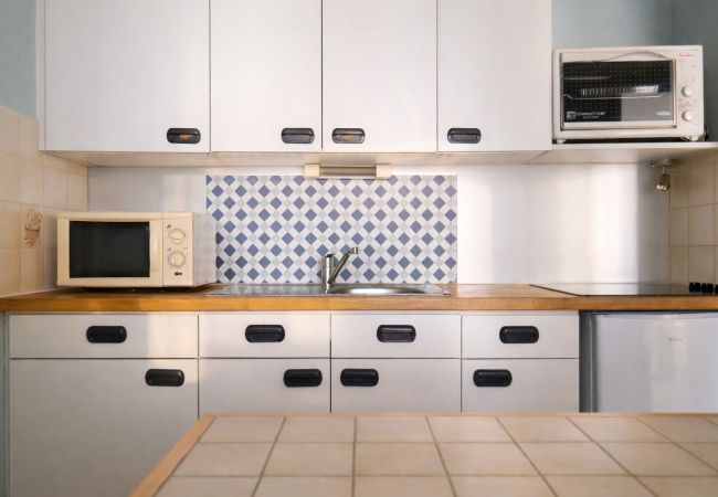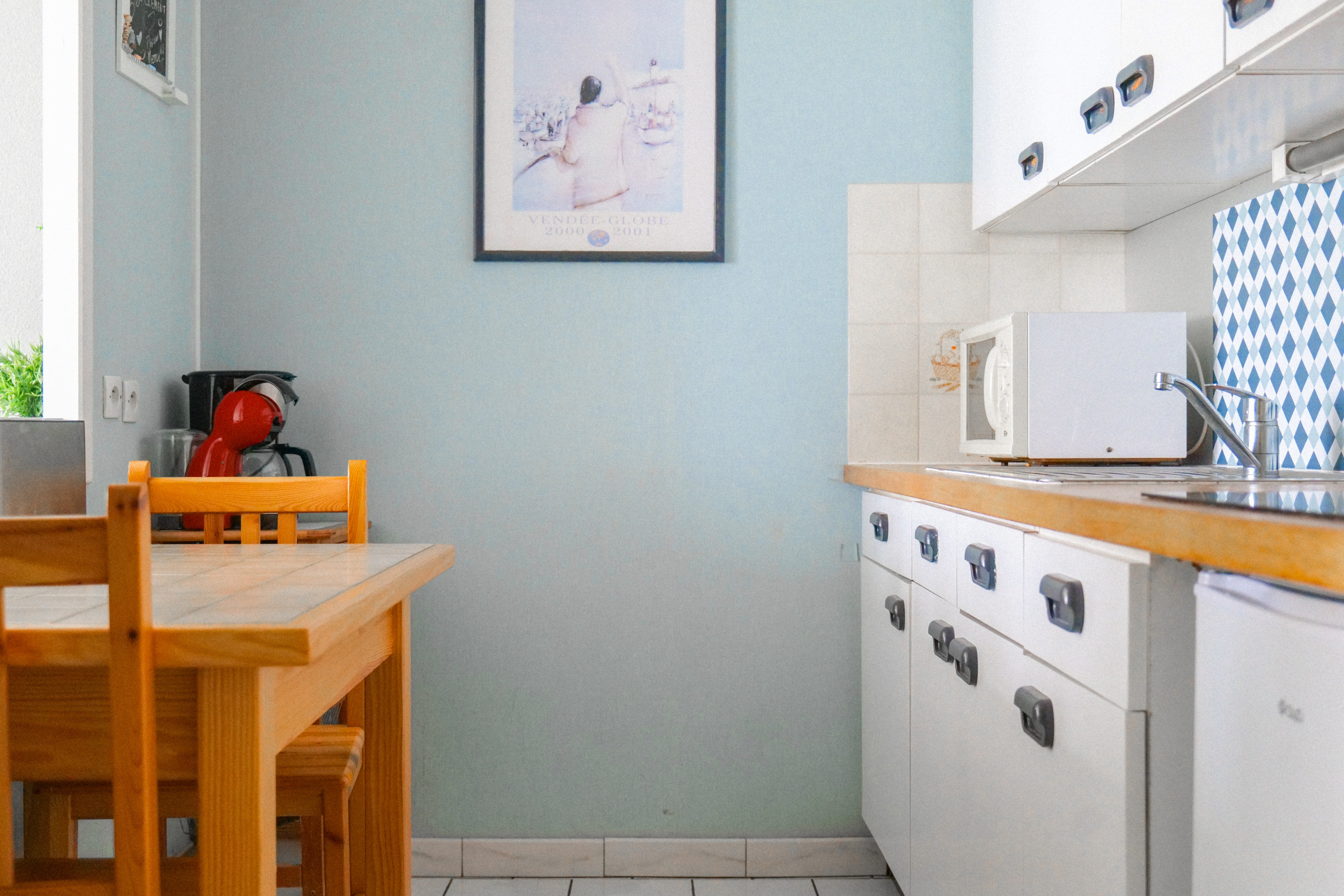 Une cuisine semi-ouverte, bien équipée : four, micro-ondes, cafetière à filtre + machine Senso.