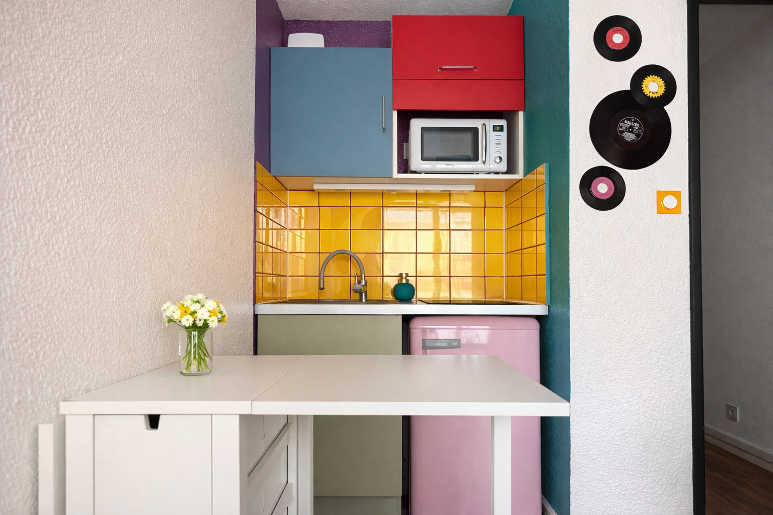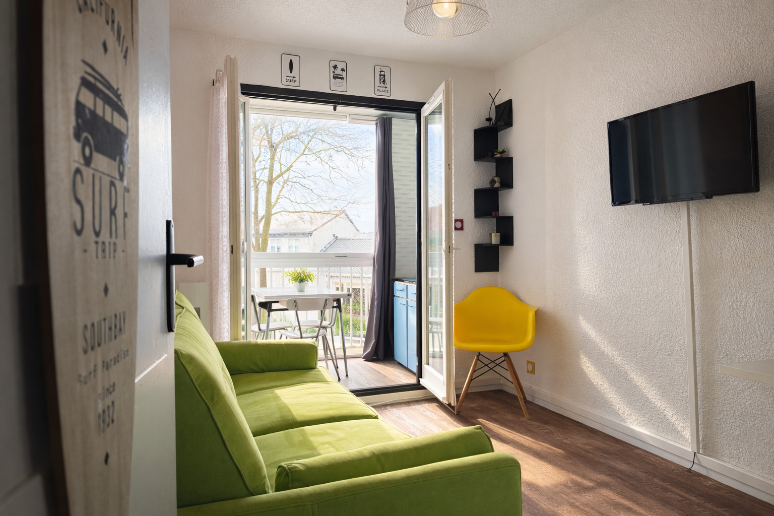 • Cuisine semi-ouverte équipée : bouilloire, micro-ondes, grille-pain, réfrigérateur, cafetière filtre