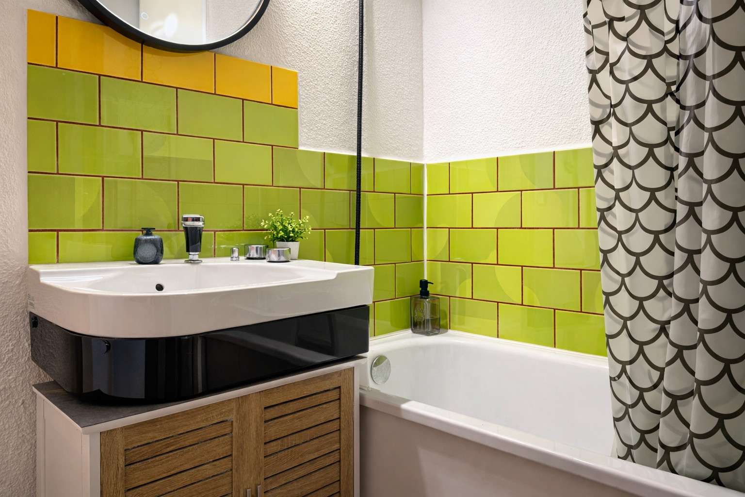 • Salle de bain avec douche, vasque, meuble de rangement, et WC