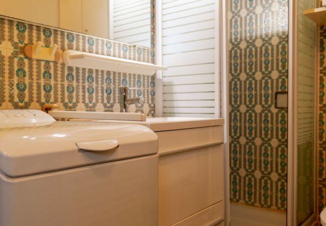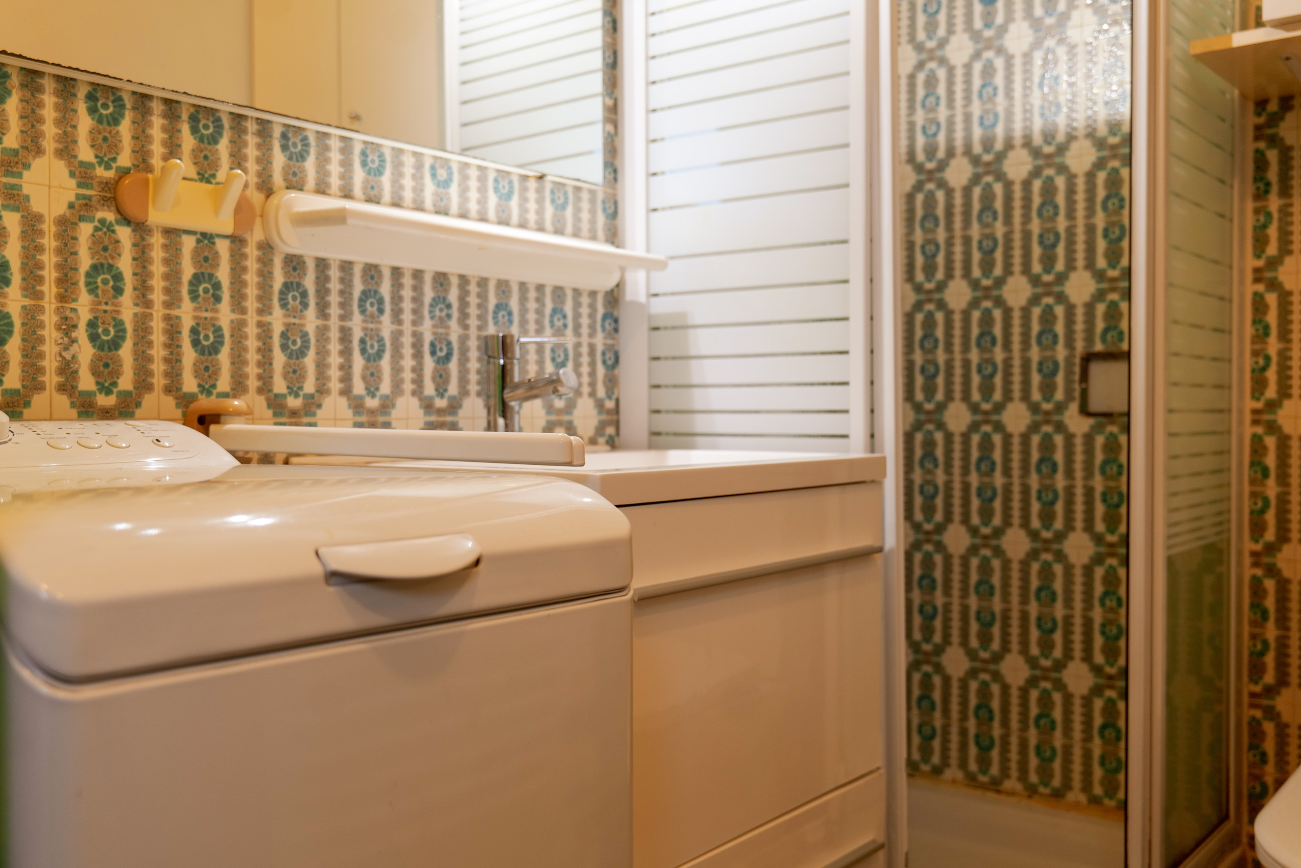 • Salle de bain avec douche, vasque, rangements, sèche-cheveux et WC