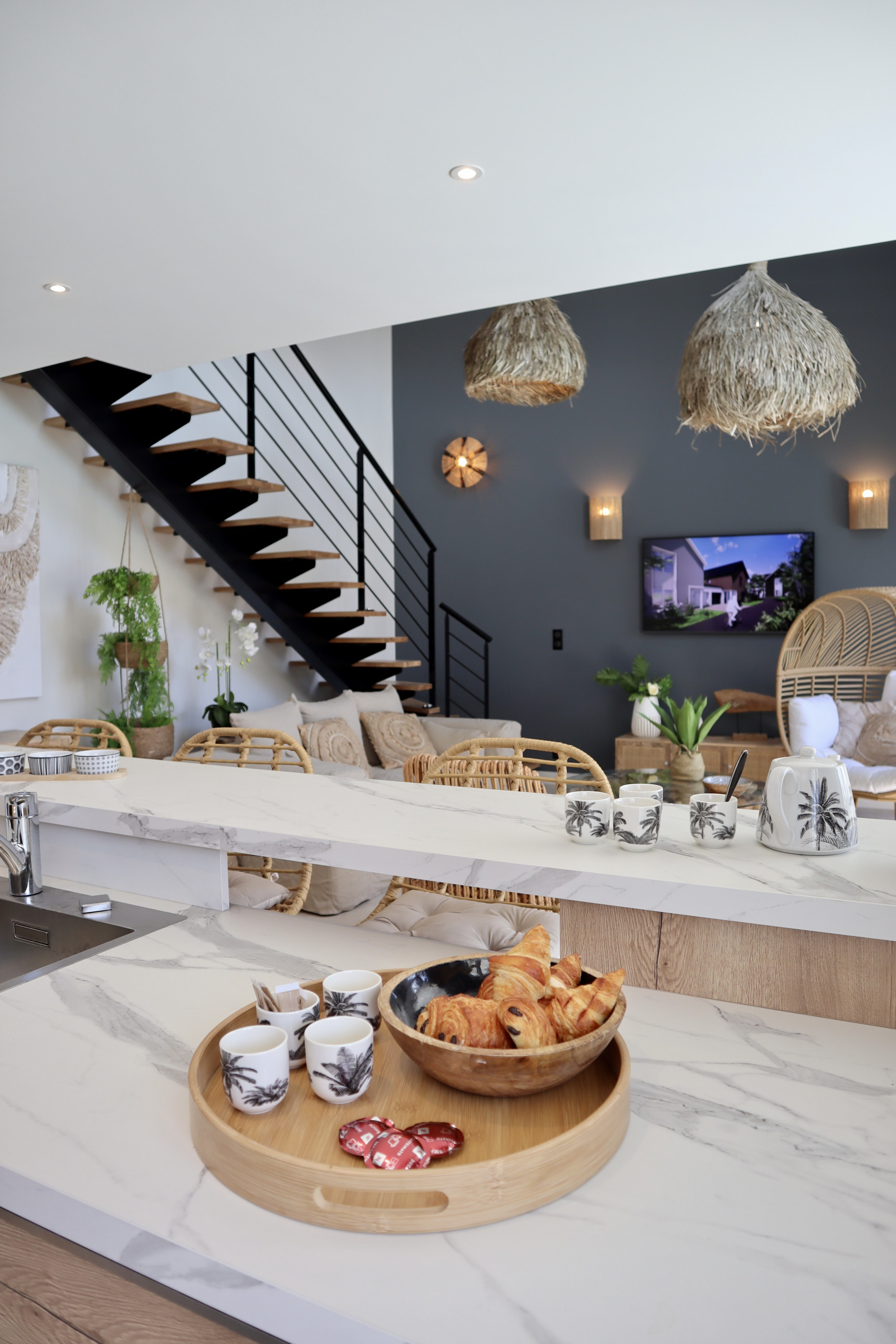 Grand espace de vie ouvert avec une cuisine entièrement équipée et une décoration soignée, conçue pour des instants de convivialité inoubliables. Climatisation réversible dans le salon / cuisine.