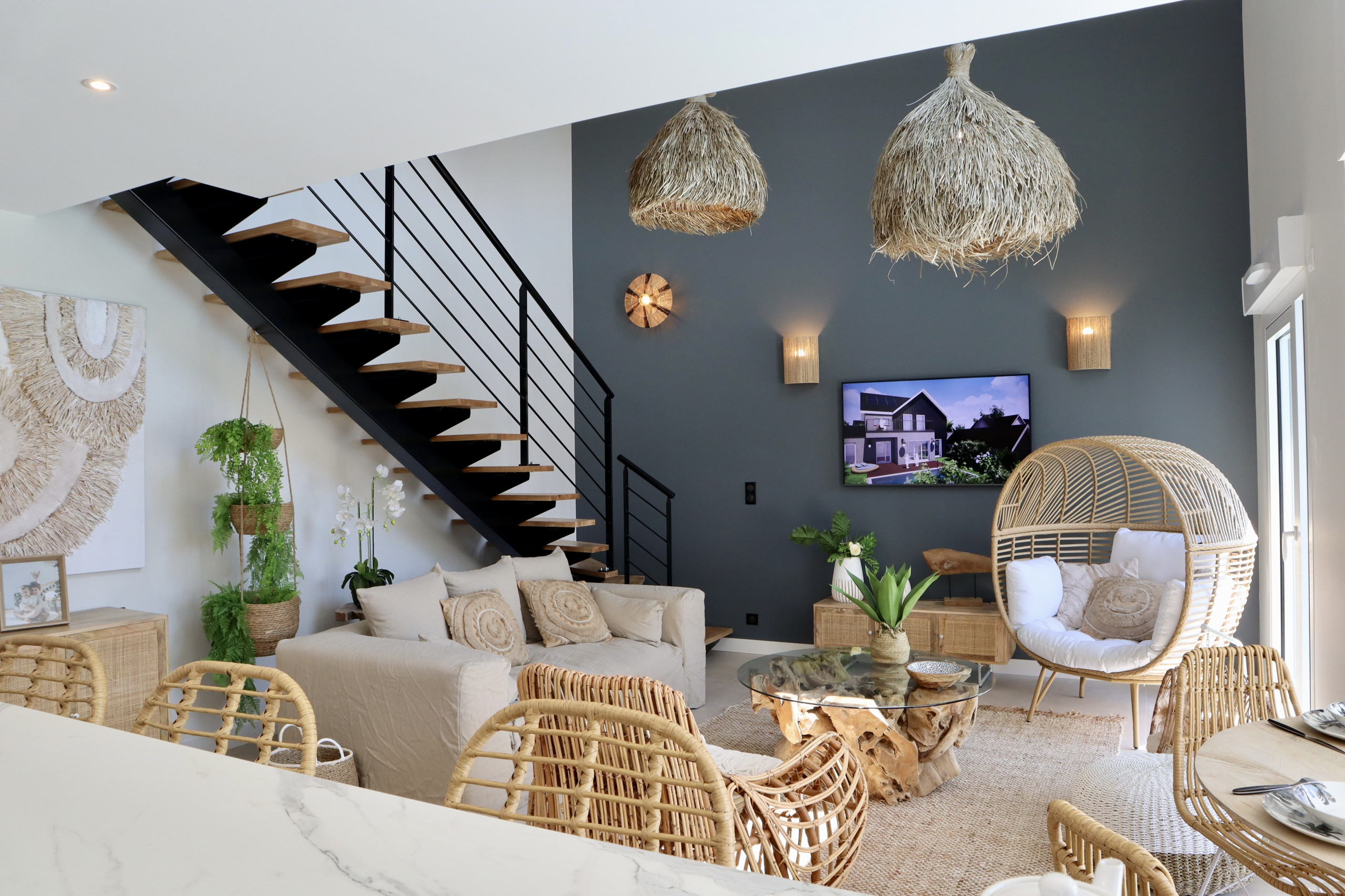 Grand espace de vie ouvert avec une cuisine entièrement équipée et une décoration soignée, conçue pour des instants de convivialité inoubliables. Climatisation réversible dans le salon / cuisine.